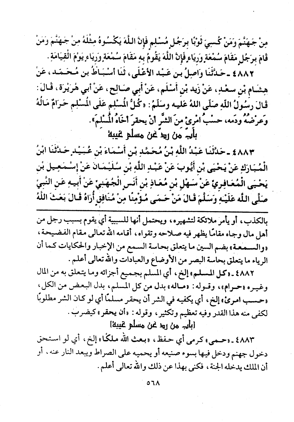 4882 - "كل المسلم" إلخ، أي المسلم بجميع أجزائه وما يتعلق به من المال وغيره "حرام"، وقوله: "ماله" بدل من كل المسلم، بدل البعض من الكل، "حسب امرئ" إلخ، أي يكفيه في الشر أن يحقر مسلمًا أي لو كان الشر مطلوبًا لكفى منه هذا القدر وفيه تعظيم وتكثير، وقوله: "أن يحقر" كيضرب.