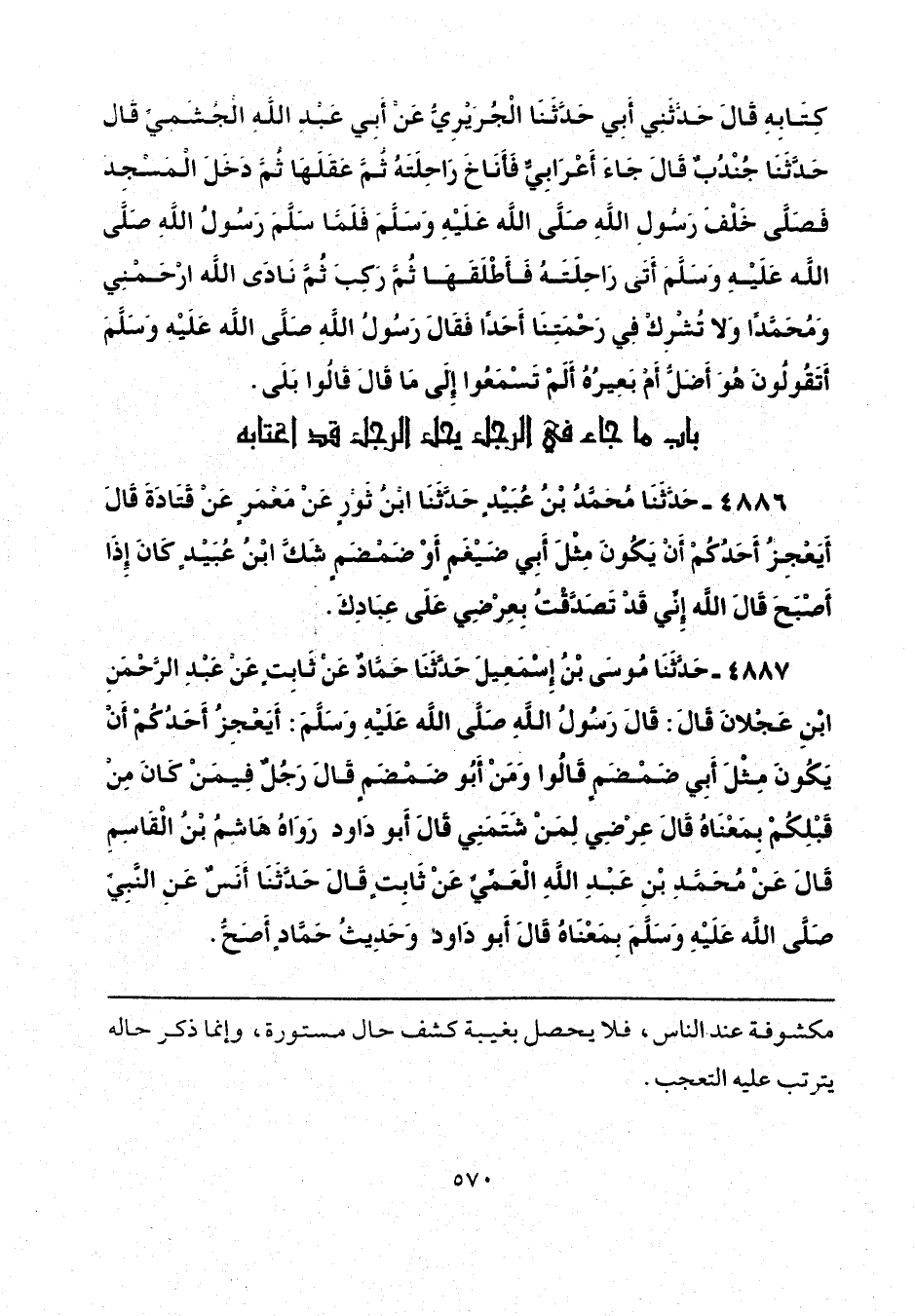كِتَابِهِ قَالَ: حَدَّثَنِي أَبِي، حَدَّثَنَا الْجُرَيْرِيُّ، عَنْ أَبِي عَبْدِ اللَّهِ الْجُشَمِيِّ، قَالَ: حَدَّثَنَا جُنْدُبٌ، قَالَ: جَاءَ أَعْرَابِيٌّ فَأَنَاخَ رَاحِلَتَهُ، ثُمَّ عَقَلَهَا، ثُمَّ دَخَلَ الْمَسْجِدَ فَصَلَّى خَلْفَ رَسُولِ اللَّهِ صَلَّى اللهُ عَلَيْهِ وَسَلَّمَ فَلَمَّا سَلَّمَ رَسُولُ اللَّهِ صَلَّى اللهُ عَلَيْهِ وَسَلَّمَ أَتَى رَاحِلَتَهُ فَأَطْلَقَهَا ثُمَّ رَكِبَ ثُمَّ نَادَى اللَّهُمَّ ارْحَمْنِي وَمُحَمَّدًا، وَلَا تُشْرِكْ فِي رَحْمَتِنَا أَحَدًا، فَقَالَ رَسُولُ اللَّهِ صَلَّى اللهُ عَلَيْهِ وَسَلَّمَ: «أَتَقُولُونَ هُوَ أَضَلُّ، أَمْ بَعِيرُهُ أَلَمْ تَسْمَعُوا إِلَى مَا قَالَ؟ » قَالُوا: بَلَى.