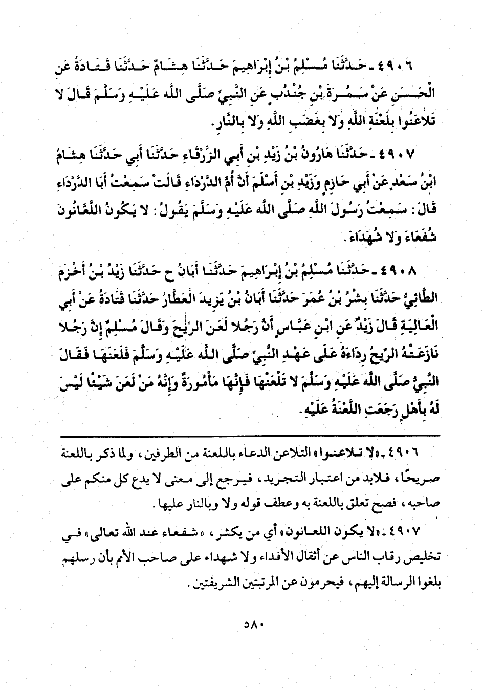 4908 - حَدَّثَنَا مُسْلِمُ بْنُ إِبْرَاهِيمَ، حَدَّثَنَا أَبَانُ، ح حَدَّثَنَا زَيْدُ بْنُ أَخْزَمَ الطَّائِيُّ، حَدَّثَنَا بِشْرُ بْنُ عُمَرَ، حَدَّثَنَا أَبَانُ بْنُ يَزِيدَ الْعَطَّارُ، حَدَّثَنَا قَتَادَةُ، عَنْ أَبِي الْعَالِيَةِ - قَالَ زَيْدٌ -: عَنِ ابْنِ عَبَّاسٍ، أَنَّ رَجُلًا لَعَنَ الرِّيحَ - وَقَالَ مُسْلِمٌ إِنَّ رَجُلًا نَازَعَتْهُ الرِّيحُ رِدَاءَهُ عَلَى عَهْدِ النَّبِيِّ صَلَّى اللهُ عَلَيْهِ وَسَلَّمَ، فَلَعَنَهَا -، فَقَالَ النَّبِيُّ صَلَّى اللهُ عَلَيْهِ وَسَلَّمَ: «لَا تَلْعَنْهَا، فَإِنَّهَا مَأْمُورَةٌ، وَإِنَّهُ مَنْ لَعَنَ شَيْئًا لَيْسَ لَهُ بِأَهْلٍ رَجَعَتِ اللَّعْنَةُ عَلَيْهِ».