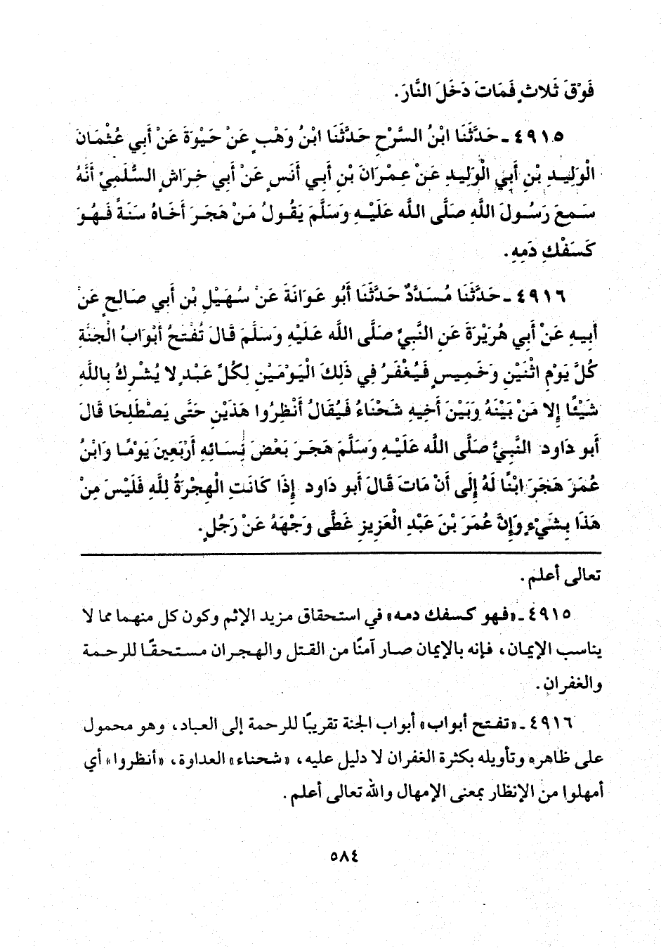 4915 - حَدَّثَنَا ابْنُ السَّرْحِ، حَدَّثَنَا ابْنُ وَهْبٍ، عَنْ حَيْوَةَ، عَنْ أَبِي عُثْمَانَ الْوَلِيدِ بْنِ أَبِي الْوَلِيدِ، عَنْ عِمْرَانَ بْنِ أَبِي أَنَسٍ، عَنْ أَبِي خِرَاشٍ السُّلَمِيِّ، أَنَّهُ سَمِعَ رَسُولَ اللَّهِ صَلَّى اللهُ عَلَيْهِ وَسَلَّمَ، يَقُولُ: «مَنْ هَجَرَ أَخَاهُ سَنَةً فَهُوَ كَسَفْكِ دَمِهِ».