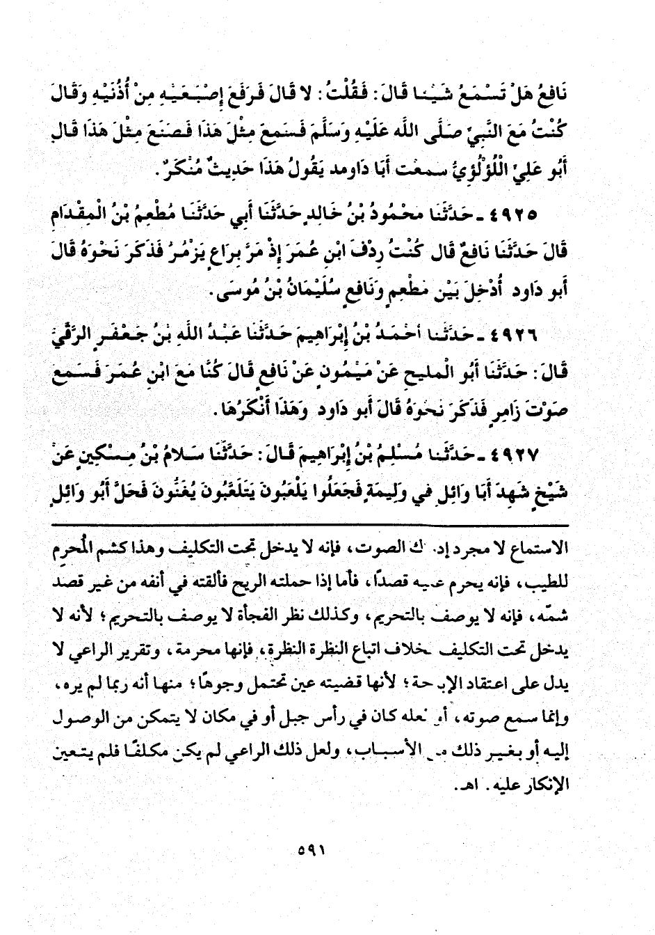الاستماع لا مجرد إدراك الصوت، فإنه لا يدخل تحت التكليف وهذا كشم المُحرِم للطيب، فإنه يحرم عليه قصدًا، فأما إذا حملته الريح فألقته في أنفه من غير قصد شمّه، فإنه لا يوصف بالتحريم، وكذلك نظر الفجأة لا يوصف بالتحريم؛ لأنه لا يدخل تحت التكليف بخلاف اتباع النظرة النظرة، فإنها محرم، وتقرير الراعي لا يدل على اعتقاد الإباحة، لأنها قضيته عين تحتمل وجوهًا؛ منها أنه ربما لم يره، وإنما سمع صوته، أو لعله كان في رأس جبل أو في مكان لا يتمكن من الوصول إليه أو بغير ذلك من الأسباب، ولعل ذلك الراعي لم يكن مكلفًا فلم يتعين الإنكار عليه. اهـ.