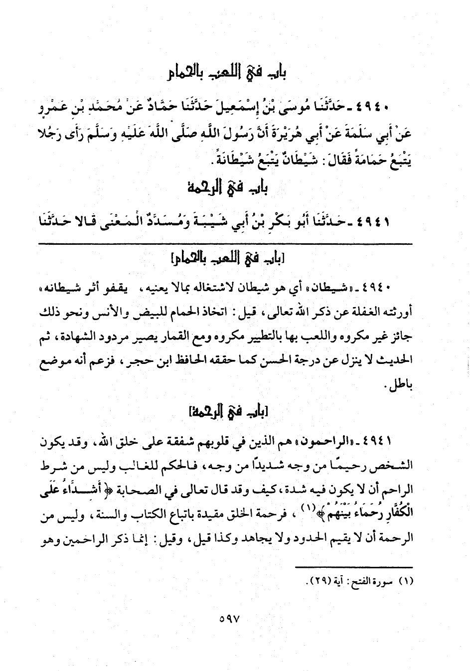 4940 - "شيطان" أي هو شيطان لاشتغاله بما لا يعنيه، يقفو أثر شيطانه، أورثته الغفلة عن ذكر الله تعالى، قيل: اتخاذ الحمام للبيض والإنس ونحو ذلك جائز غير مكروه واللعب بها للتطيير مكروه ومع القمار يصير مردود الشهادة، ثم الحديث لا ينزل عن درجة الحسن كما حققه الحافظ ابن حجر، فزعم أنه موضوع باطل.