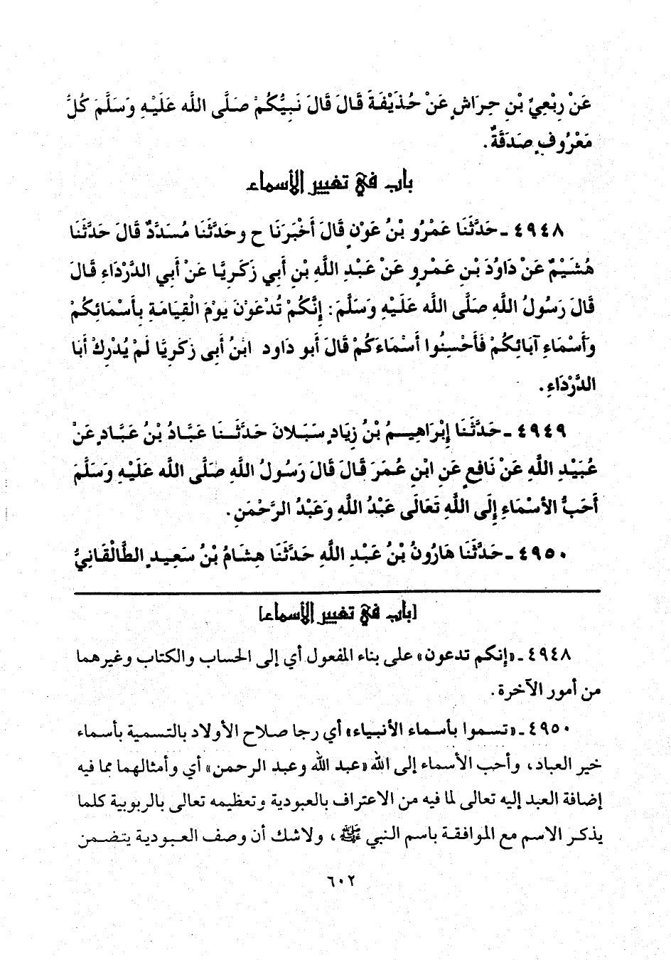 4950 - "تسموا بأسماء الأنبياء" أي رجا صلاح الأولاد بالتسمية بأسماء خير العباد، وأحب الأسماء إلى الله "عبد الله وعبد الرحمن" أي وأمثالهما مما فيه إضافة الجد إليه تعالى لما فيه من الاعتراف بالعبودية وتعظيمه تعالى بالربوبية كلما يذكر الاسم مع الموافقة باسم النبي - صلى الله عليه وسلم -، ولا شك أن وصف العبودية يتضمن
