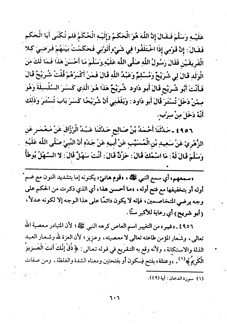 4956 - حَدَّثَنَا أَحْمَدُ بْنُ صَالِحٍ، حَدَّثَنَا عَبْدُ الْرَّزَّاقِ، عَنْ مَعْمَرٍ، عَنِ الزُّهْرِيِّ، عَنْ سَعِيدِ بْنِ الْمُسَيِّبِ، عَنْ أَبِيهِ، عَنْ جَدِّهِ، أَنَّ النَّبِيَّ صَلَّى اللهُ عَلَيْهِ وَسَلَّمَ، قَالَ لَهُ: «مَا اسْمُكَ؟ » قَالَ: حَزْنٌ، قَالَ: «أَنْتَ سَهْلٌ» قَالَ: لَا، السَّهْلُ يُوطَأُ