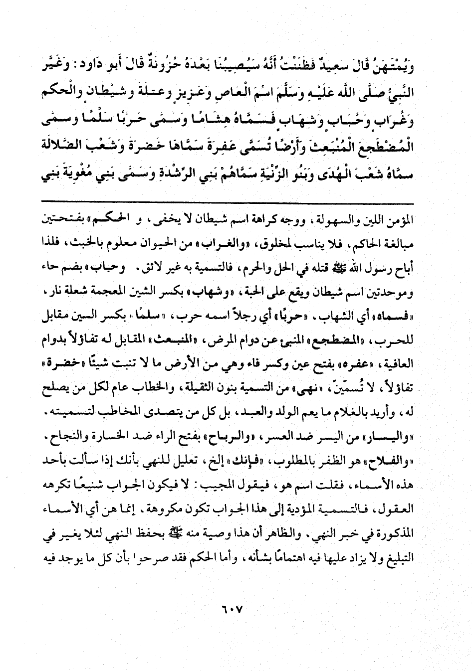 المؤمن اللين والسهولة، ووجه كراهة اسم شيطان لا يخفى، والحكم" بفتحتين مبالغة الحاكم، فلا يناسب لمخلوق، "والغراب" من الحيوان معلوم بالخبث، فلذا أباح رسول الله - صلى الله عليه وسلم - قتله في الحل والحرم، فالتسمية به غير لائق، وحباب" بضم جاء وموحدتين اسم شيطان ويقع على الحبة، "وشهاب" بكسر الشين المعجمة شعلة نار، "فسماه" أي الشهاب، "حربًا" أي رجلًا اسمه حرب، "سلمًا" بكسر السين مقابل للحرب، "المضطجع" المنبئ عن دوام المرض، "المنبعث" المقابل له تفاؤلًا بدوام العافية، "عفره" بفتح عين وكسر فاء وهي من الأرض ما لا تنبت شيئًا "خضرة" تفاؤلًا، لا تُسمّينّ، "نهى" من التسمية بنون الثقيلة، والخطاب عام لكل من يصلح له، وأريد بالغلام ما يعم الولد والعبد، بل كل من يتصدى المخاطب لتسميته، "واليسار" من اليسر ضد العسر، "والرباح" بفتح الراء ضد الخسارة والنجاح، "والفلاح" هو الظفر بالمطلوب، "فإنك" إلخ، تعليل للنهي بأنك إذا سألت بأحد هذه الأسماء، فقلت اسم هو، فيقول المجيب: لا فيكون الجواب شنيعًا تكرهه العقول، فالتمسية المؤدية إلى هذا الجواب تكون مكروهة، إنما هن أي الأسماء المذكورة في خبر النهي، والظاهر أن هذا وصية منه - صلى الله عليه وسلم - بحفظ النهي لئلا يغير في التبليغ ولا يزاد عليها فيه اهتمامًا بشأنه، وأما الحكم فقد صرحوا بأن كل ما يوجد فيه