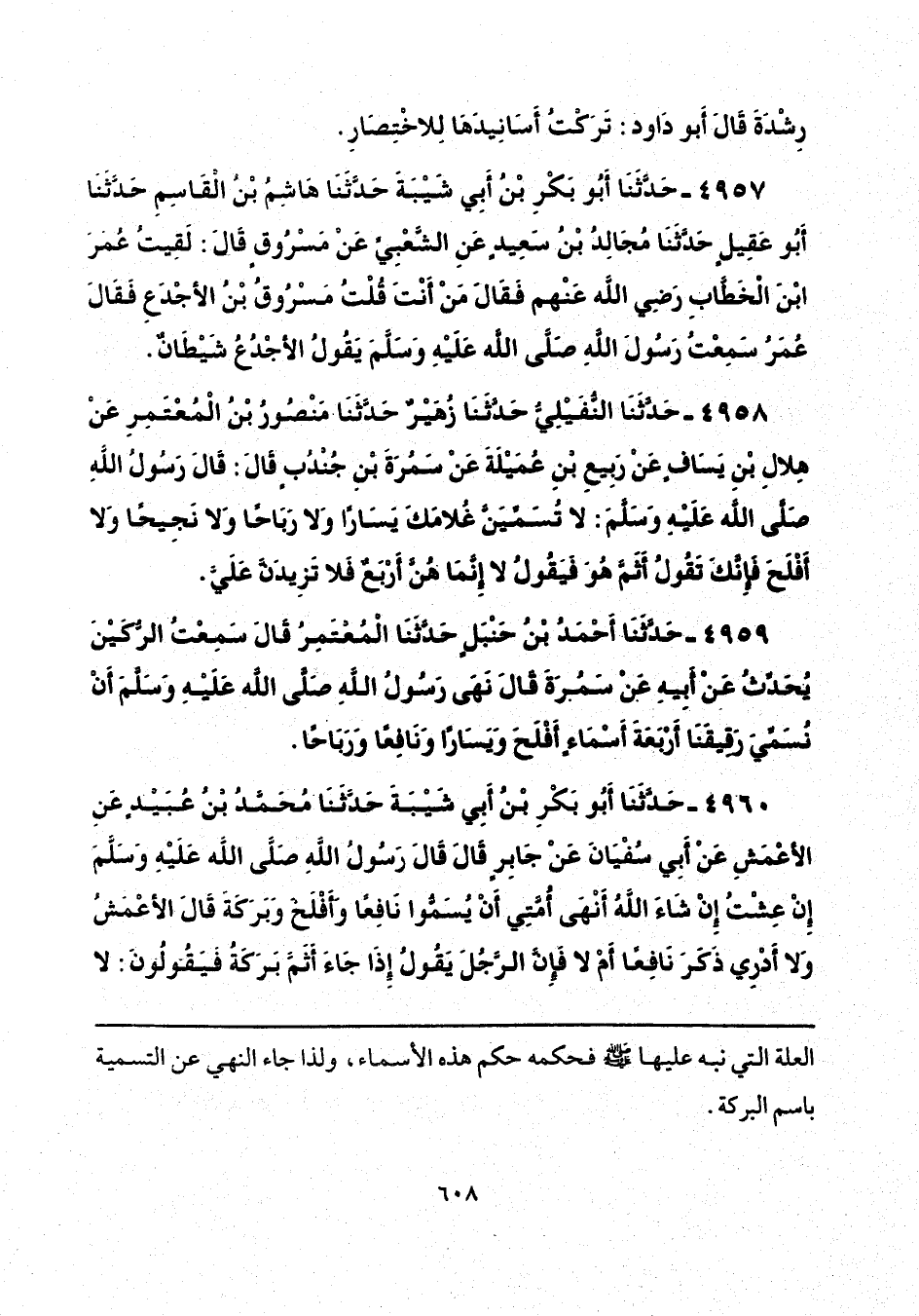 4959 - حَدَّثَنَا أَحْمَدُ بْنُ حَنْبَلٍ، حَدَّثَنَا الْمُعْتَمِرُ، قَالَ: سَمِعْتُ الرُّكَيْنَ، يُحَدِّثُ عَنْ أَبِيهِ، عَنْ سَمُرَةَ، قَالَ: «نَهَى رَسُولُ اللَّهِ صَلَّى اللهُ عَلَيْهِ وَسَلَّمَ أَنْ نُسَمِّيَ رَقِيقَنَا أَرْبَعَةَ أَسْمَاءٍ أَفْلَحَ، وَيَسَارًا، وَنَافِعًا، وَرَبَاحًا».