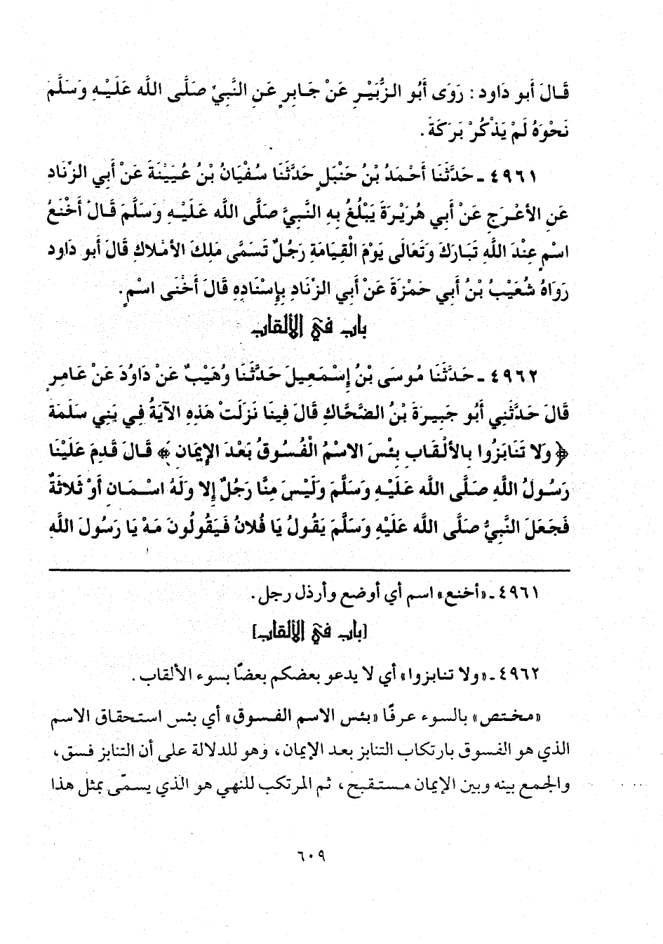 4962 - "ولا تنابزوا" أي لا يدعو بعضكم بعضًا بسوء الألقاب.