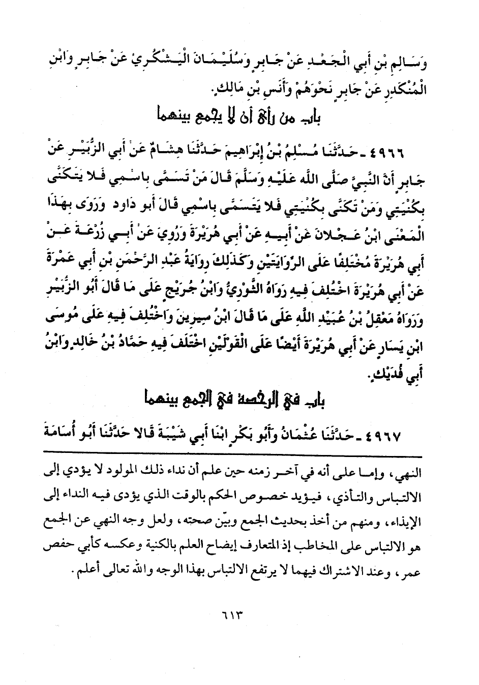 النهي، وإما على أنه في آخر زمنه حين علم أن نداء ذلك المولود لا يؤدي إلى الالتباس والتأذي، فيؤيد خصوص الحكم بالوقت الذي يؤدى فيه النداء إلى الإيذاء، ومنهم من أخذ بحديث الجمع وبيّن صحته، ولعل وجه النهي عن الجمع هو الالتباس على المخاطب إذ المتعارف إيضاح العلم بالكنية وعكسه كأبي حفص عمر، وعند الاشتراك فيهما لا يرتفع الالتباس بهذا الوجه والله تعالى أعلم.