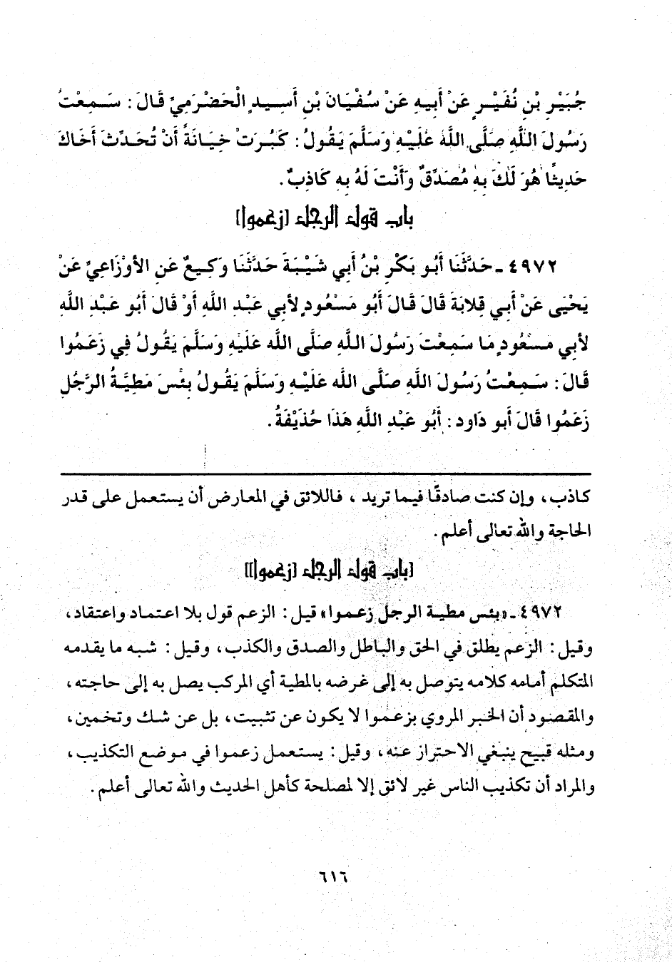 4972 - حَدَّثَنَا أَبُو بَكْرِ بْنُ أَبِي شَيْبَةَ، حَدَّثَنَا وَكِيعٌ، عَنِ الْأَوْزَاعِيِّ، عَنْ يَحْيَى، عَنْ أَبِي قِلَابَةَ، قَالَ: قَالَ أَبُو مَسْعُودٍ لِأَبِي عَبْدِ اللَّهِ أَوْ قَالَ: أَبُو عَبْدِ اللَّهِ لِأَبِي مَسْعُودٍ مَا سَمِعْتَ رَسُولَ اللَّهِ صَلَّى اللهُ عَلَيْهِ وَسَلَّمَ يَقُولُ: فِي «زَعَمُوا؟ » قَالَ: سَمِعْتُ رَسُولَ اللَّهِ صَلَّى اللهُ عَلَيْهِ وَسَلَّمَ يَقُولُ: «بِئْسَ مَطِيَّةُ الرَّجُلِ زَعَمُوا» قَالَ أَبُو دَاوُدَ: " أَبُو عَبْدِ اللَّهِ هَذَا: حُذَيْفَةُ.