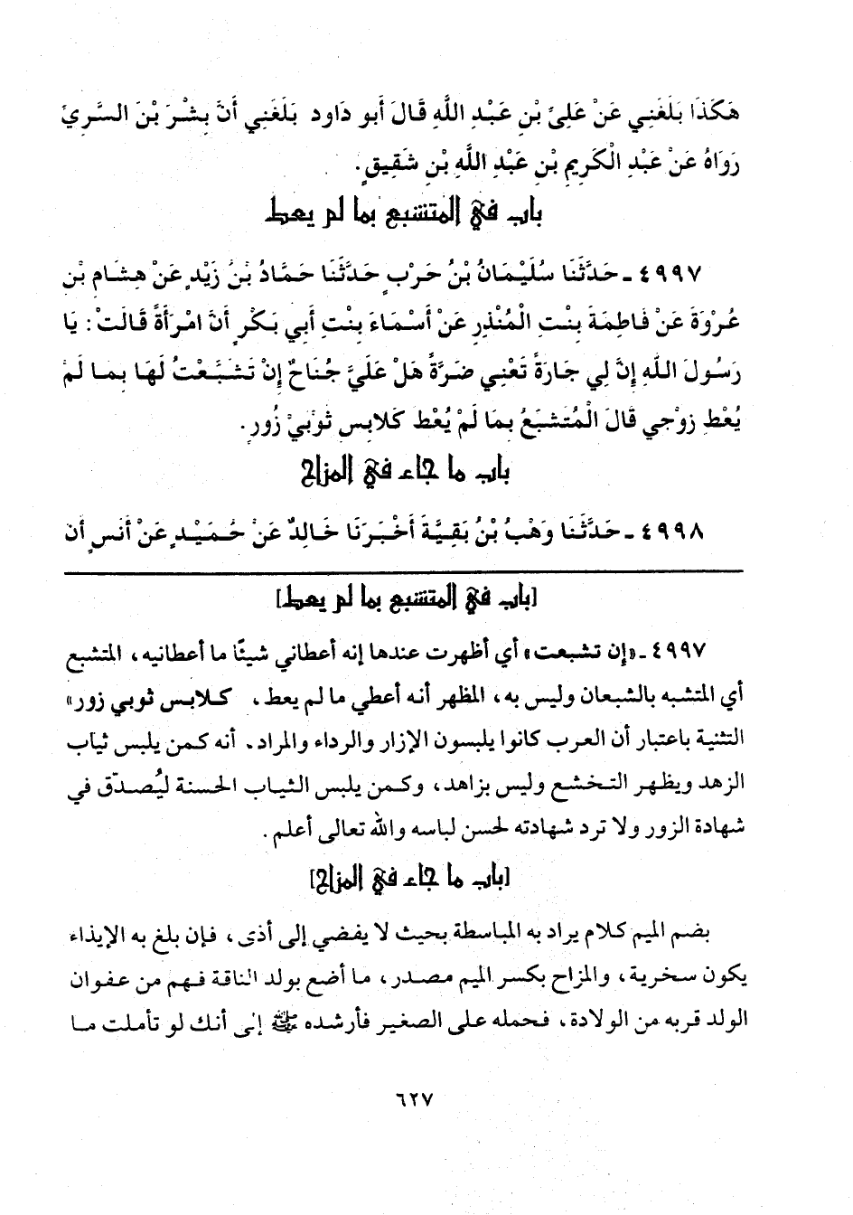 4997 - "إن تشبعت" أي أظهرت عندها إنه أعطاني شيئًا ما أعطانيه، المتشبع أي المتشبه بالشبعان وليس به، المظهر أنه أعطي ما لم يعط، كلابس ثوبي زور" الثنية باعتبار أن العرب كانوا يلبسون الإزار والرداء والمراد، أنه كمن يلبس ثياب الزهد ويظهر التخشع وليس بزاهد، وكمن يلبس الثياب الحسنة ليُصدّق في شهادة الزور ولا ترد شهادته لحسن لباسه والله تعالى أعلم.