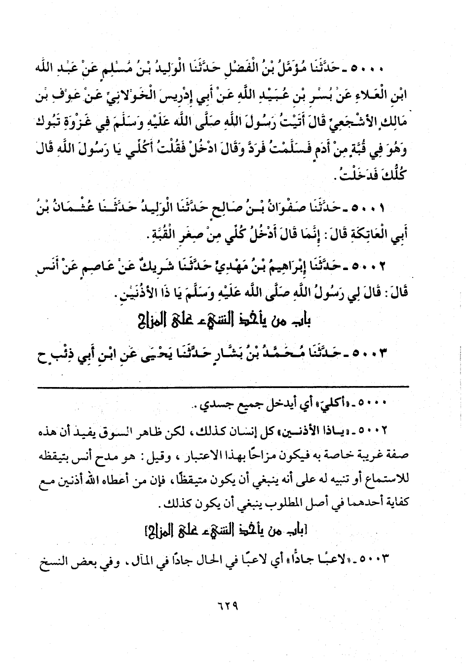 5002 - "يا ذا الأذنين" كل إنسان كذلك، لكن ظاهر السوق يفيد أن هذه صفة غريبة خاصة به فيكون مزاحًا بهذا الاعتبار، وقيل: هو مدح أنس بتيقظه للاستماع أو تنبيه له على أنه ينبغي أن يكون متيقظًا، فإن من أعطاه الله أذنين مع كفاية أحدهما في أصل المطلوب ينبغي أن يكون كذلك.