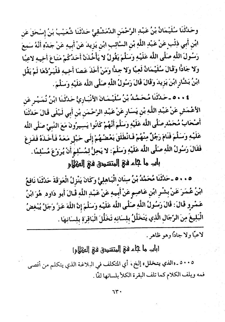 5005 - حَدَّثَنَا مُحَمَّدُ بْنُ سِنَانٍ الْبَاهِلِيُّ، وَكَانَ يَنْزِلُ الْعَوَقَةَ حَدَّثَنَا نَافِعُ بْنُ عُمَرَ، عَنْ بِشْرِ بْنِ عَاصِمٍ، عَنْ أَبِيهِ، عَنْ عَبْدِ اللَّهِ، قَالَ أَبُو دَاوُدَ: «هُوَ ابْنُ عَمْرٍو» قَالَ: قَالَ رَسُولُ اللَّهِ صَلَّى اللهُ عَلَيْهِ وَسَلَّمَ: «إِنَّ اللَّهَ عَزَّ وَجَلَّ يُبْغِضُ الْبَلِيغَ مِنَ الرِّجَالِ الَّذِي يَتَخَلَّلُ بِلِسَانِهِ تَخَلُّلَ الْبَاقِرَةِ بِلِسَانِهَا».