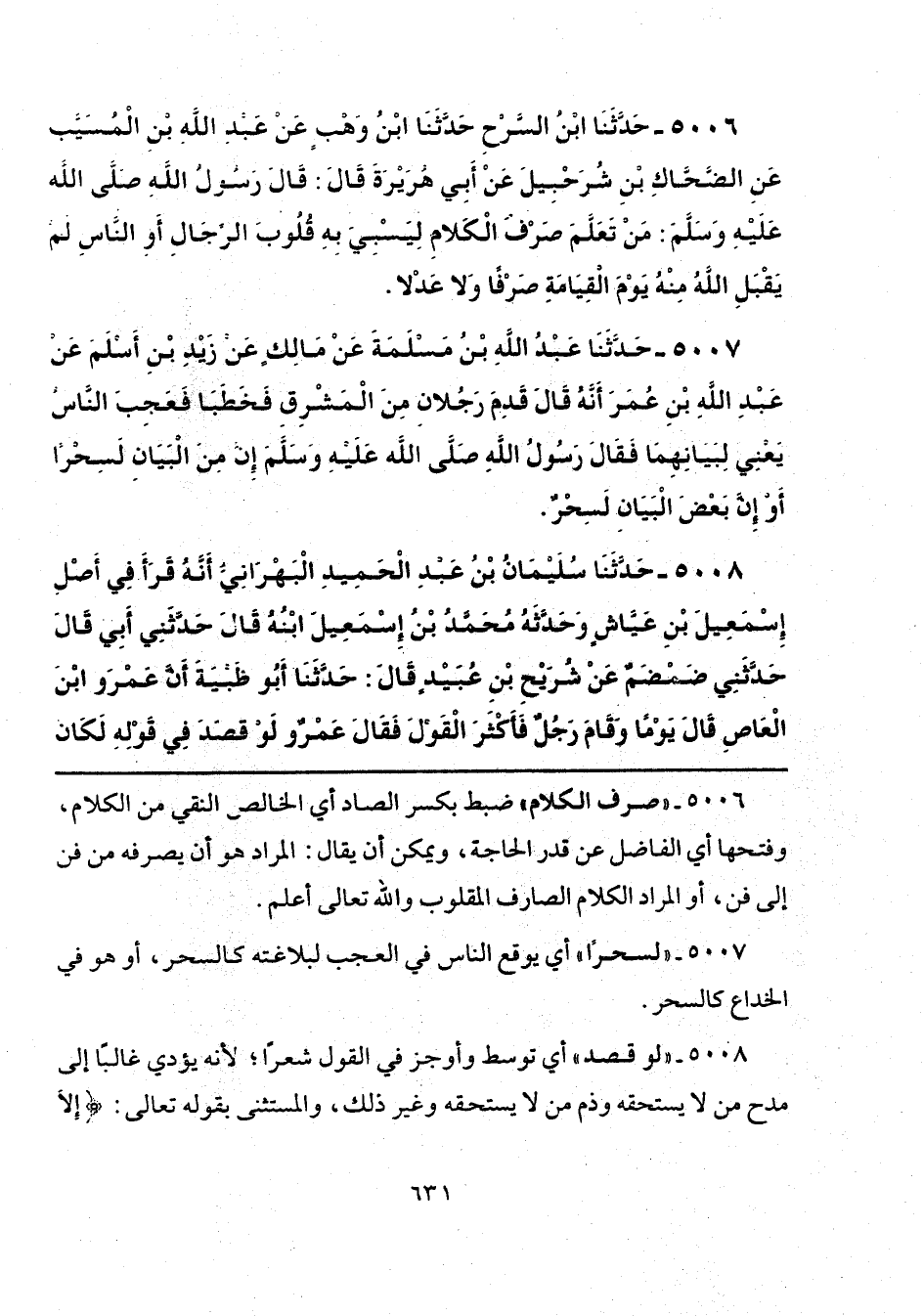 5006 - "صرف الكلام" ضبط بكسر الصاد أي الخالص النقي من الكلام، وفتحها أي الفاضل عن قدر الحاجة، ويمكن أن يقال: المراد هو أن يصرفه من فن إلى فن، أو المراد الكلام الصارف المقلوب والله تعالى أعلم.