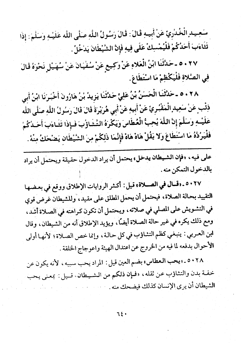 5027 - "قال في الصلاة" قيل: أكثر الروايات الإطلاق ووقع في بعضها التقييد بحالة الصلاة، فيحتمل أن يحمل المطلق على مقيد، وللشيطان غرض قوي في التشويش على المصلي في صلاته، ويحتمل أن تكون كراهته في الصلاة أشد، ومع ذلك يكره في غير حالة الصلاة أيضًا، ويؤيد الإطلاق أنه من الشيطان، وقال ابن العربي: ينبغي كظم التثاؤب في كل حالة، وإنما خص الصلاة؛ لأنها أولى الأحوال بدفعه لما فيه من الخروج عن اعتدال الهيئة واعوجاج الخلقة.