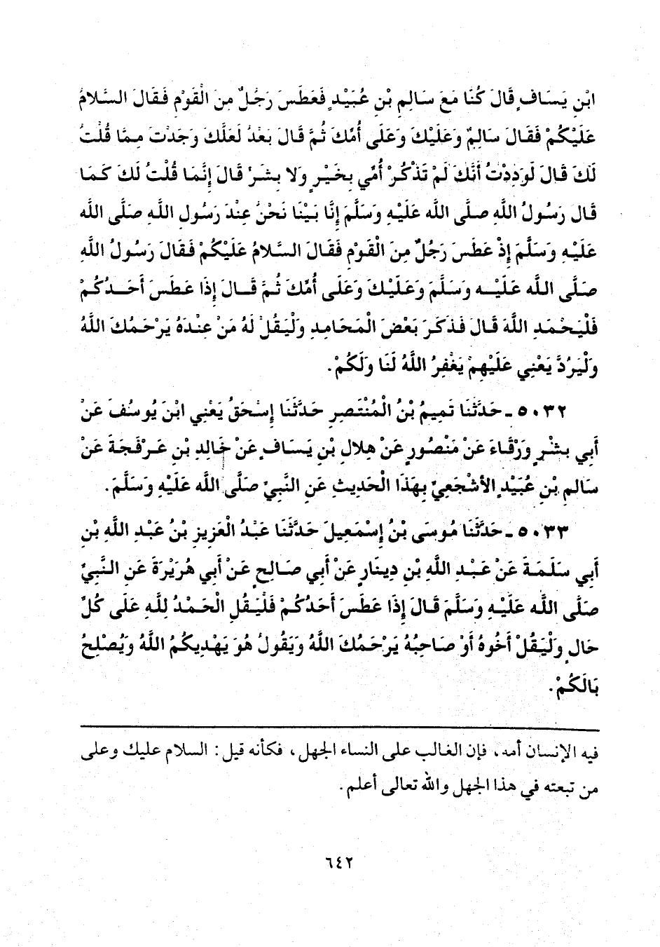 بْنِ يَسَافٍ، قَالَ: كُنَّا مَعَ سَالِمِ بْنِ عُبَيْدٍ فَعَطَسَ رَجُلٌ مِنَ الْقَوْمِ، فَقَالَ: السَّلَامُ عَلَيْكُمْ، فَقَالَ سَالِمٌ: وَعَلَيْكَ وَعَلَى أُمِّكَ، ثُمَّ قَالَ بَعْدُ: لَعَلَّكَ وَجَدْتَ مِمَّا قُلْتُ لَكَ، قَالَ: لَوَدِدْتُ أَنَّكَ لَمْ تَذْكُرْ أُمِّي بِخَيْرٍ وَلَا بِشَرٍّ، قَالَ: إِنَّمَا قُلْتُ لَكَ كَمَا قَالَ رَسُولُ اللَّهِ صَلَّى اللهُ عَلَيْهِ وَسَلَّمَ، إِنَّا بَيْنَا نَحْنُ عِنْدَ رَسُولِ اللَّهِ صَلَّى اللهُ عَلَيْهِ وَسَلَّمَ إِذْ عَطَسَ رَجُلٌ مِنَ الْقَوْمِ فَقَالَ: السَّلَامُ عَلَيْكُمْ، فَقَالَ رَسُولُ اللَّهِ صَلَّى اللهُ عَلَيْهِ وَسَلَّمَ «وَعَلَيْكَ وَعَلَى أُمِّكَ» ثُمَّ قَالَ «إِذَا عَطَسَ أَحَدُكُمْ فَلْيَحْمَدِ اللَّهَ» قَالَ: فَذَكَرَ بَعْضَ الْمَحَامِدِ، «وَلْيَقُلْ لَهُ مَنْ عِنْدَهُ يَرْحَمُكَ اللَّهُ وَلْيَرُدَّ - يَعْنِي عَلَيْهِمْ - يَغْفِرُ اللَّهُ لَنَا وَلَكُمْ».
