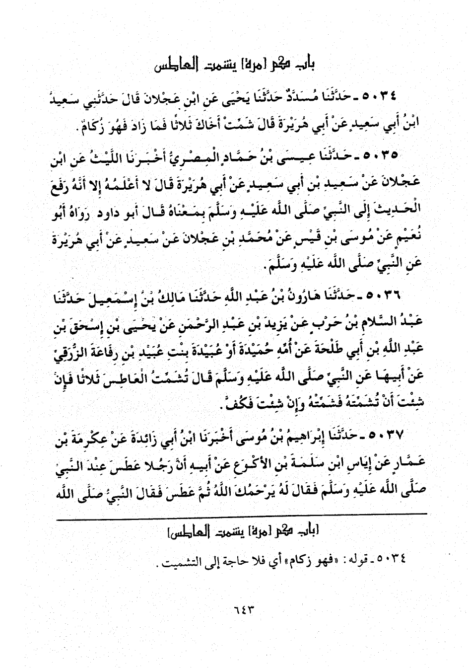 5034 - حَدَّثَنَا مُسَدَّدٌ، حَدَّثَنَا يَحْيَى، عَنِ ابْنِ عَجْلَانَ، قَالَ: حَدَّثَنِي سَعِيدُ بْنُ أَبِي سَعِيدٍ، عَنْ أَبِي هُرَيْرَةَ، قَالَ «شَمِّتْ أَخَاكَ ثَلَاثًا فَمَا زَادَ فَهُوَ زُكَامٌ».