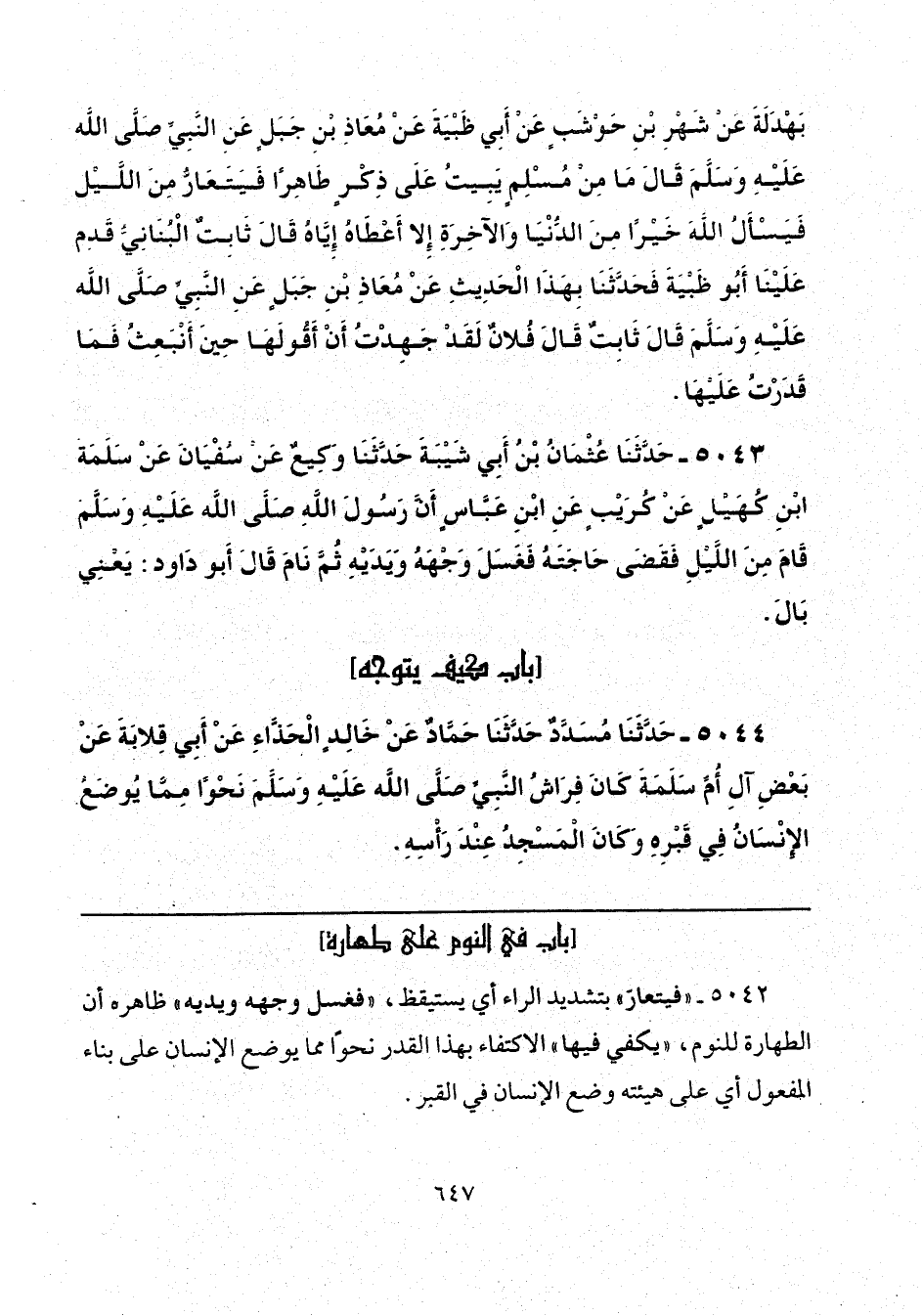 5043 - حَدَّثَنَا عُثْمَانُ بْنُ أَبِي شَيْبَةَ، حَدَّثَنَا وَكِيعٌ، عَنْ سُفْيَانَ، عَنْ سَلَمَةَ بْنِ كُهَيْلٍ، عَنْ كُرَيْبٍ، عَنِ ابْنِ عَبَّاسٍ: «أَنَّ رَسُولَ اللَّهِ صَلَّى اللهُ عَلَيْهِ وَسَلَّمَ قَامَ مِنَ اللَّيْلِ فَقَضَى حَاجَتَهُ فَغَسَلَ وَجْهَهُ، وَيَدَيْهِ، ثُمَّ نَامَ» قَالَ أَبُو دَاوُدَ: «يَعْنِي بَالَ».