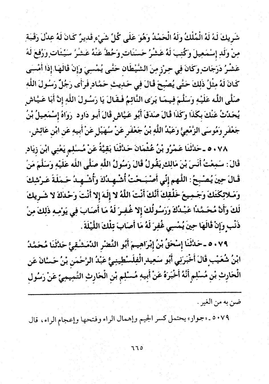 5078 - حَدَّثَنَا عَمْرُو بْنُ عُثْمَانَ، حَدَّثَنَا بَقِيَّةُ، عَنْ مُسْلِمٍ يَعْنِي ابْنَ زِيَادٍ، قَالَ: سَمِعْتُ أَنَسَ بْنَ مَالِكٍ، يَقُولُ: قَالَ رَسُولُ اللَّهِ صَلَّى اللهُ عَلَيْهِ وَسَلَّمَ: مَنْ قَالَ حِينَ يُصْبِحُ: اللَّهُمَّ إِنِّي أَصْبَحْتُ أُشْهِدُكَ، وَأُشْهِدُ حَمَلَةَ عَرْشِكَ، وَمَلَائِكَتَكَ وَجَمِيعَ خَلْقِكَ، أَنَّكَ أَنْتَ اللَّهُ لَا إِلَهَ إِلَّا أَنْتَ وَحْدَكَ لَا شَرِيكَ لَكَ، وَأَنَّ مُحَمَّدًا عَبْدُكَ وَرَسُولُكَ، إِلَّا غُفِرَ لَهُ مَا أَصَابَ فِي يَوْمِهِ ذَلِكَ مِنْ ذَنْبٍ، وَإِنْ قَالَهَا حِينَ يُمْسِي غُفِرَ لَهُ مَا أَصَابَ تِلْكَ اللَّيْلَةَ.