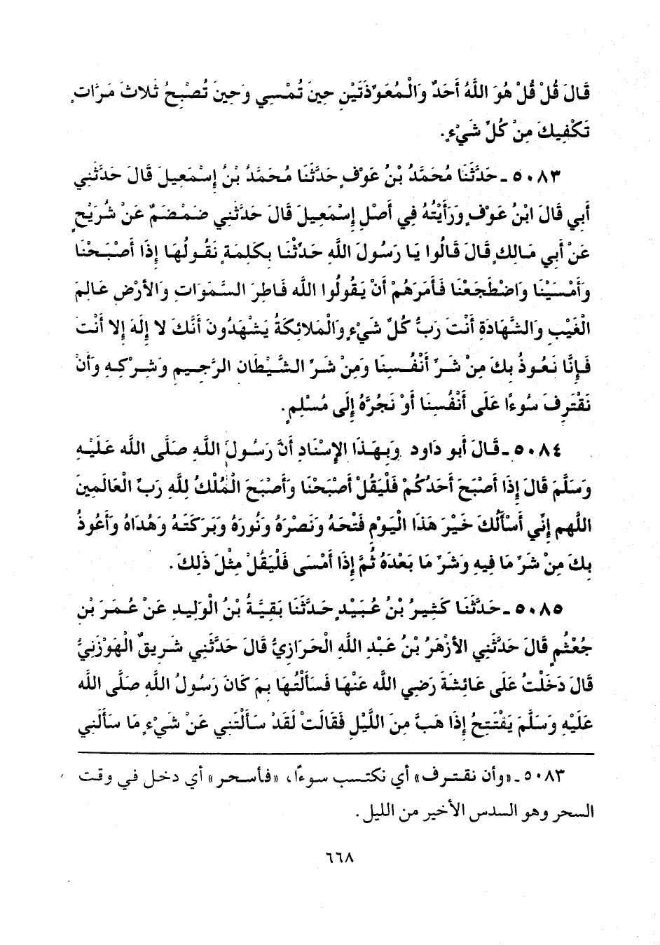 5083 - حَدَّثَنَا مُحَمَّدُ بْنُ عَوْفٍ، حَدَّثَنَا مُحَمَّدُ بْنُ إِسْمَاعِيلَ قَالَ: حَدَّثَنِي أَبِي - قَالَ ابْنُ عَوْفٍ: وَرَأَيْتُهُ فِي أَصْلِ إِسْمَاعِيلَ - قَالَ: حَدَّثَنِي ضَمْضَمٌ، عَنْ شُرَيْحٍ، عَنْ أَبِي مَالِكٍ، قَالَ: قَالُوا: يَا رَسُولَ اللَّهِ حَدِّثْنَا بِكَلِمَةٍ نَقُولُهَا إِذَا أَصْبَحْنَا، وَأَمْسَيْنَا، وَاضْطَجَعْنَا، فَأَمَرَهُمْ أَنْ يَقُولُوا: «اللَّهُمَّ فَاطِرَ السَّمَوَاتِ، وَالْأَرْضِ، عَالِمَ الْغَيْبِ وَالشَّهَادَةِ، أَنْتَ رَبُّ كُلِّ شَيْءٍ وَالْمَلَائِكَةُ يَشْهَدُونَ أَنَّكَ لَا إِلَهَ إِلَّا أَنْتَ، فَإِنَّا نَعُوذُ بِكَ مِنْ شَرِّ أَنْفُسِنَا، وَمِنْ شَرِّ الشَّيْطَانِ الرَّجِيمِ، وَشِرْكِهِ، وَأَنْ نَقْتَرِفَ سُوءًا عَلَى أَنْفُسِنَا أَوْ نَجُرَّهُ إِلَى مُسْلِمٍ».