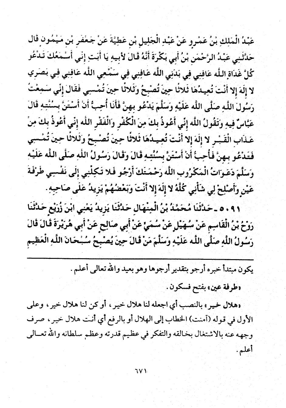 5091 - حَدَّثَنَا مُحَمَّدُ بْنُ الْمِنْهَالِ، حَدَّثَنَا يَزِيدُ يَعْنِي ابْنَ زُرَيْعٍ، حَدَّثَنَا رَوْحُ بْنُ الْقَاسِمِ، عَنْ سُهَيْلٍ، عَنْ سُمَيٍّ، عَنْ أَبِي صَالِحٍ، عَنْ أَبِي هُرَيْرَةَ، قَالَ: قَالَ رَسُولُ اللَّهِ صَلَّى اللهُ عَلَيْهِ وَسَلَّمَ: «مَنْ قَالَ حِينَ يُصْبِحُ سُبْحَانَ اللَّهِ الْعَظِيمِ،