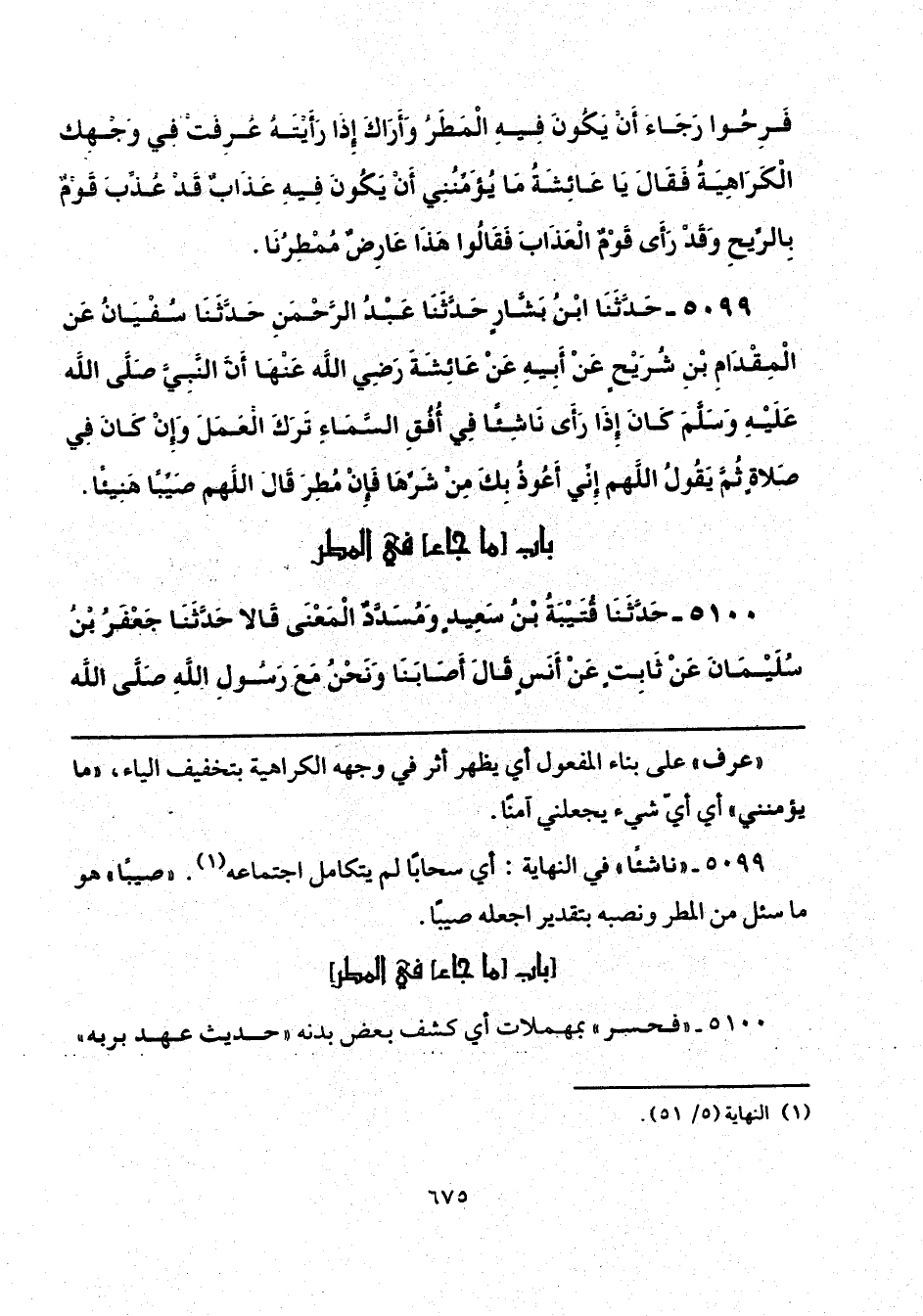 5099 - حَدَّثَنَا ابْنُ بَشَّارٍ، حَدَّثَنَا عَبْدُ الرَّحْمَنِ، حَدَّثَنَا سُفْيَانُ، عَنِ الْمِقْدَامِ بْنِ شُرَيْحٍ، عَنْ أَبِيهِ، عَنْ عَائِشَةَ رَضِيَ اللَّهُ عَنْهَا، أَنَّ النَّبِيَّ صَلَّى اللهُ عَلَيْهِ وَسَلَّمَ، كَانَ إِذَا رَأَى نَاشِئًا فِي أُفُقِ السَّمَاءِ تَرَكَ الْعَمَلَ وَإِنْ كَانَ فِي صَلَاةٍ، ثُمَّ يَقُولُ: «اللَّهُمَّ إِنِّي أَعُوذُ بِكَ مِنْ شَرِّهَا» فَإِنْ مُطِرَ قَالَ: «اللَّهُمَّ صَيِّبًا هَنِيئًا».