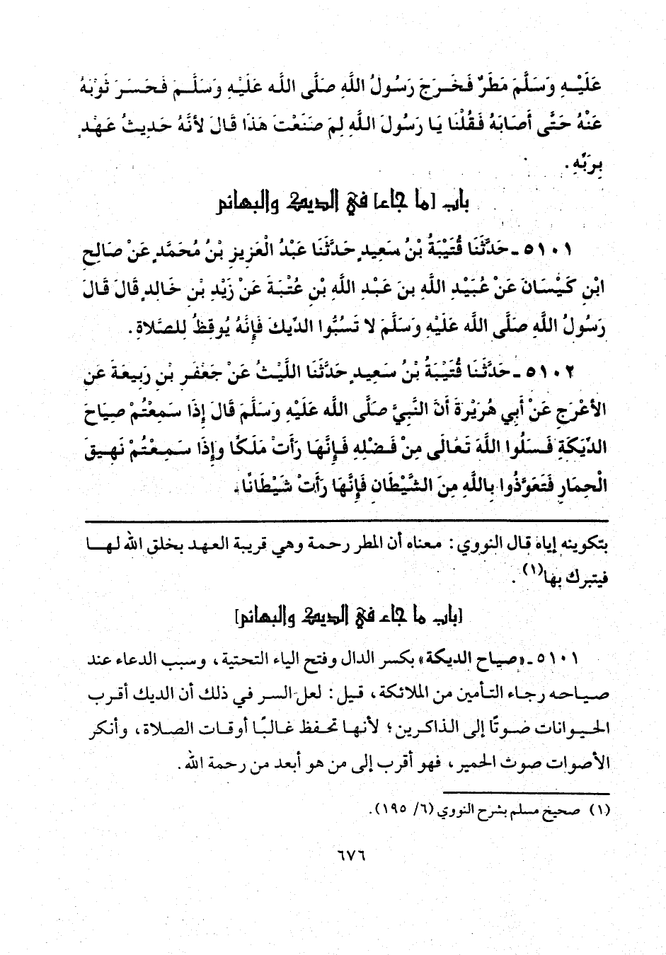 5101 - "صياح الديكة" بكسر الدال وفتح الياء التحتية، وسبب الدعاء عند صياحه رجاء التأمين من الملائكة، قيل: لعل السر في ذلك أن الديك أقرب الحيوانات صوتًا إلى الذاكرين؛ لأنها تحفظ غالبًا أوقات الصَّلاة، وأنكر الأصوات صوت الحمير، فهو أقرب إلى من هو أبعد من رحمة الله.