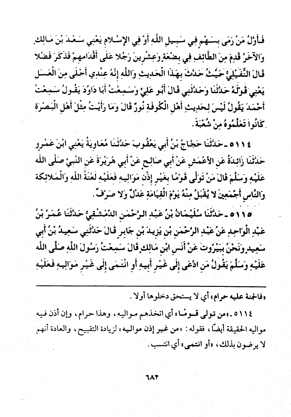 فَأَوَّلُ مَنْ رَمَى بِسَهْمٍ فِي سَبِيلِ اللَّهِ، أَوْ فِي الْإِسْلَامِ، يَعْنِي سَعْدَ بْنَ مَالِكٍ، وَالْآخَرُ قَدِمَ مِنَ الطَّائِفِ فِي بِضْعَةٍ وَعِشْرِينَ رَجُلًا عَلَى أَقْدَامِهِمْ، فَذَكَرَ فَضْلًا قَالَ النُّفَيْلِيُّ حَيْثُ حَدَّثَ بِهَذَا الْحَدِيثِ، وَاللَّهِ إِنَّهُ عِنْدِي أَحْلَى مِنَ الْعَسَلِ، يَعْنِي قَوْلَهُ حَدَّثَنَا وَحَدَّثَنِي قَالَ أَبُو عَلِيٍّ: وَسَمِعْتُ أَبَا دَاوُدَ يَقُولُ: سَمِعْتُ أَحْمَدَ يَقُولُ لَيْسَ لِحَدِيثِ أَهْلِ الْكُوفَةِ نُورٌ، قَالَ: وَمَا رَأَيْتُ مِثْلَ أَهْلِ الْبَصْرَةِ كَانُوا تَعَلَّمُوهُ مِنْ شُعْبَةَ.