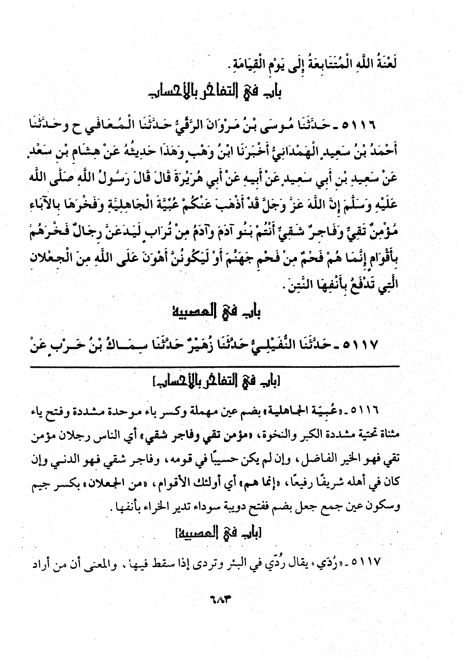 5116 - "عُبِيّة الجاهلية" بضم عين مهملة وكسر باء موحدة مشددة وفتح ياء مثناة تحتية مشددة الكبر والنخوة، "مؤمن تقي وفاجر شقي" أي النَّاس رجلان مؤمن تقي فهو الخير الفاضل، وإن لم يكن حسيبًا في قومه، وفاجر شقي فهو الدني وإن كان في أهله شريفًا رفيعًا، "إنَّما هم" أي أولئك الأقوام، "من الجعلان" بكسر جيم وسكون عين جمع جعل بضم ففتح دويبة سوداء تدير الخراء بأنفها.