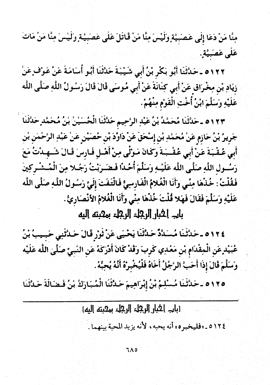 5124 - حَدَّثَنَا مُسَدَّدٌ، حَدَّثَنَا يَحْيَى، عَنْ ثَوْرٍ، قَالَ: حَدَّثَنِي حَبِيبُ بْنُ عُبَيْدٍ، عَنِ الْمِقْدَامِ بْنِ مَعْدِي كَرِبَ، وَقَدْ كَانَ أَدْرَكَهُ عَنِ النَّبِيِّ صَلَّى اللهُ عَلَيْهِ وَسَلَّمَ، قَالَ: «إِذَا أَحَبَّ الرَّجُلُ أَخَاهُ فَلْيُخْبِرْهُ أَنَّهُ يُحِبُّهُ».