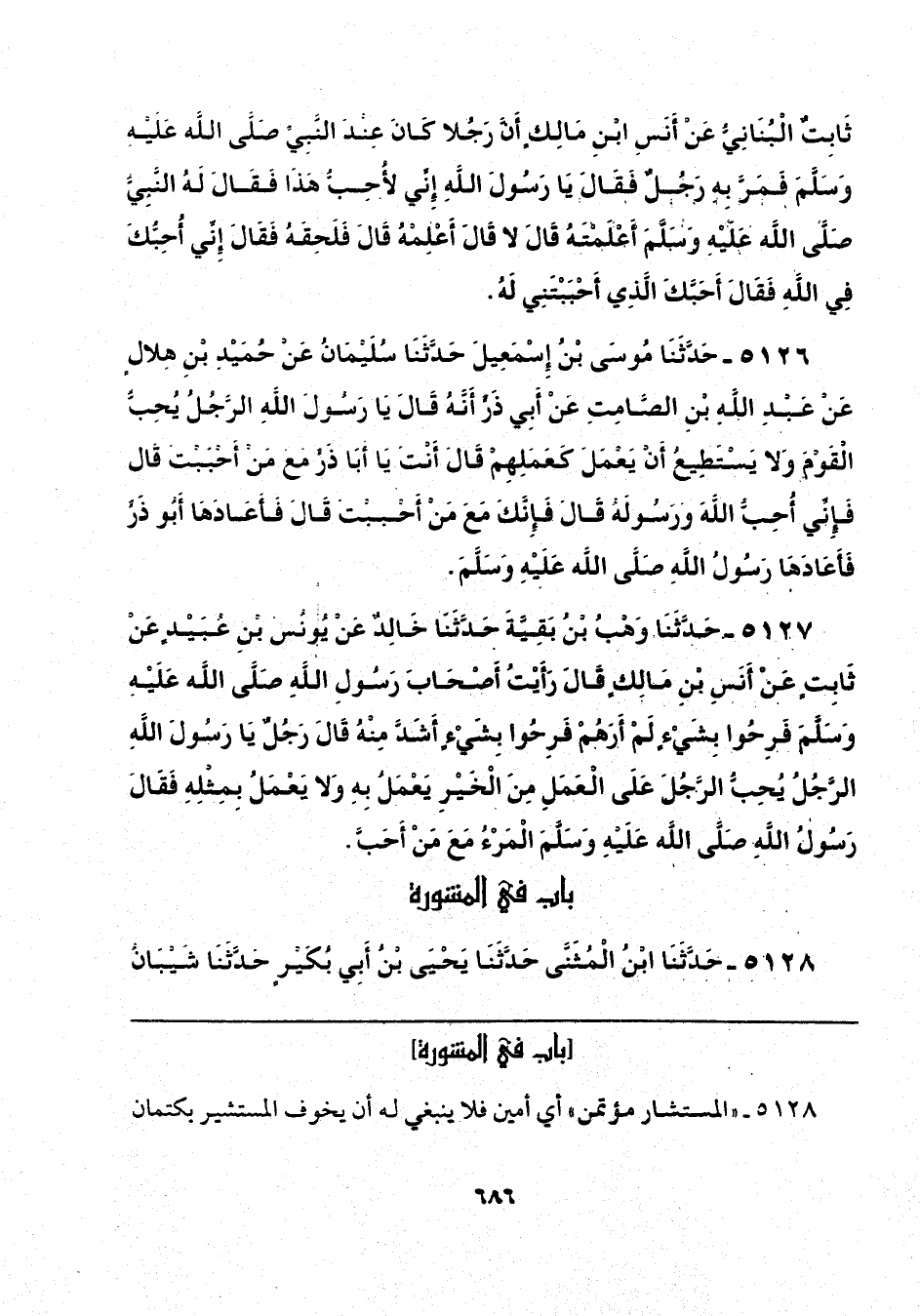 ثَابِتٌ الْبُنَانِيُّ، عَنْ أَنَسِ بْنِ مَالِكٍ، أَنَّ رَجُلًا كَانَ عِنْدَ النَّبِيِّ صَلَّى اللهُ عَلَيْهِ وَسَلَّمَ، فَمَرَّ بِهِ رَجُلٌ فَقَالَ: يَا رَسُولَ اللَّهِ، إِنِّي لَأُحِبُّ هَذَا، فَقَالَ لَهُ النَّبِيُّ صَلَّى اللهُ عَلَيْهِ وَسَلَّمَ: «أَعْلَمْتَهُ؟ » قَالَ: لَا، قَالَ: «أَعْلِمْهُ» قَالَ: فَلَحِقَهُ، فَقَالَ: إِنِّي أُحِبُّكَ فِي اللَّهِ، فَقَالَ: أَحَبَّكَ الَّذِي أَحْبَبْتَنِي لَهُ.