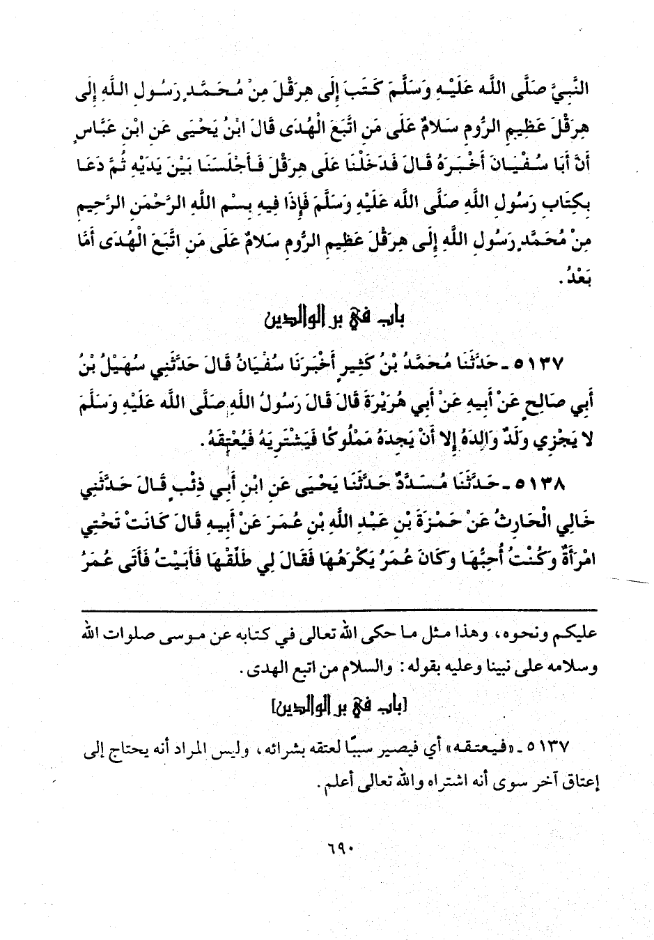 النَّبِيَّ صَلَّى اللهُ عَلَيْهِ وَسَلَّمَ، كَتَبَ إِلَى هِرَقْلَ «مِنْ مُحَمَّدٍ رَسُولِ اللَّهِ إِلَى هِرَقْلَ عَظِيمِ الرُّومِ، سَلَامٌ عَلَى مَنِ اتَّبَعَ الْهُدَى» قَالَ ابْنُ يَحْيَى، عَنِ ابْنِ عَبَّاسٍ، أَنَّ أَبَا سُفْيَانَ أَخْبَرَهُ قَالَ: فَدَخَلْنَا عَلَى هِرَقْلَ فَأَجْلَسَنَا بَيْنَ يَدَيْهِ، ثُمَّ دَعَا بِكِتَابِ رَسُولِ اللَّهِ صَلَّى اللهُ عَلَيْهِ وَسَلَّمَ فَإِذَا فِيهِ «بِسْمِ اللَّهِ الرَّحْمَنِ الرَّحِيمِ مِنْ مُحَمَّدٍ رَسُولِ اللَّهِ إِلَى هِرَقْلَ عَظِيمِ الرُّومِ سَلَامٌ عَلَى مَنِ اتَّبَعَ الْهُدَى أَمَّا بَعْدُ».