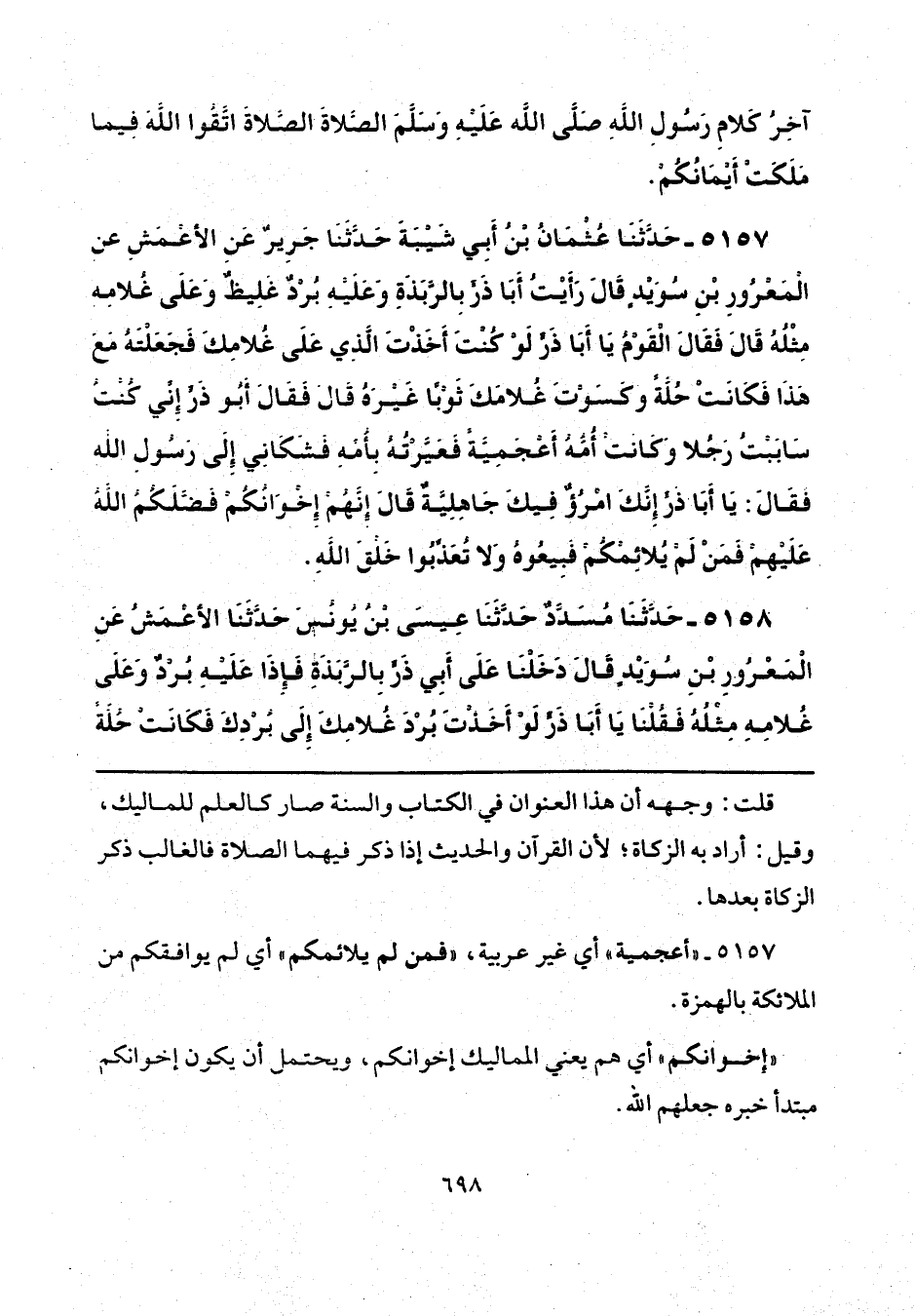 5158 - حَدَّثَنَا مُسَدَّدٌ، حَدَّثَنَا عِيسَى بْنُ يُونُسَ، حَدَّثَنَا الْأَعْمَشُ، عَنِ الْمَعْرُورِ بْنِ سُوَيْدٍ، قَالَ: دَخَلْنَا عَلَى أَبِي ذَرٍّ بِالرَّبَذَةِ فَإِذَا عَلَيْهِ بُرْدٌ وَعَلَى غُلَامِهِ مِثْلُهُ، فَقُلْنَا يَا أَبَا ذَرٍّ لَوْ أَخَذْتَ بُرْدَ غُلَامِكَ إِلَى بُرْدِكَ فَكَانَتْ حُلَّةً