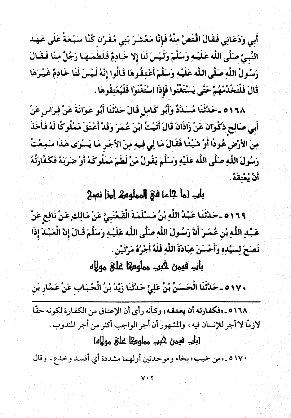 5168 - حَدَّثَنَا مُسَدَّدٌ، وَأَبُو كَامِلٍ، قَالَ: حَدَّثَنَا أَبُو عَوَانَةَ، عَنْ فِرَاسٍ، عَنْ أَبِي صَالِحٍ ذَكْوَانَ عَنْ زَاذَانَ، قَالَ: أَتَيْتُ ابْنَ عُمَرَ وَقَدْ أَعْتَقَ مَمْلُوكًا لَهُ فَأَخَذَ مِنَ الْأَرْضِ عُودًا، أَوْ شَيْئًا، فَقَالَ: مَا لِي فِيهِ مِنَ الْأَجْرِ مَا يَسْوَى هَذَا سَمِعْتُ رَسُولَ اللَّهِ صَلَّى اللهُ عَلَيْهِ وَسَلَّمَ يَقُولُ: «مَنْ لَطَمَ مَمْلُوكَهُ، أَوْ ضَرَبَهُ، فَكَفَّارَتُهُ أَنْ يُعْتِقَهُ».