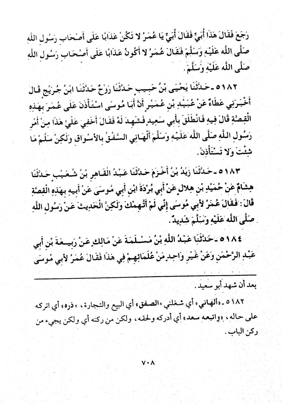 5182 - حَدَّثَنَا يَحْيَى بْنُ حَبِيبٍ، حَدَّثَنَا رَوْحٌ، حَدَّثَنَا ابْنُ جُرَيْجٍ، قَالَ: أَخْبَرَنِي عَطَاءٌ، عَنْ عُبَيْدِ بْنِ عُمَيْرٍ، أَنَّ أَبَا مُوسَى، اسْتَأْذَنَ عَلَى عُمَرَ بِهَذِهِ الْقِصَّةِ قَالَ فِيهِ: فَانْطَلَقَ بِأَبِي سَعِيدٍ فَشَهِدَ لَهُ فَقَالَ: أَخَفِيَ عَلَيَّ هَذَا مِنْ أَمْرِ رَسُولِ اللَّهِ صَلَّى اللَّهُ عَلَيْهِ؟ وَسَلَّمَ أَلْهَانِي السَّفْقُ بِالْأَسْوَاقِ، وَلَكِنْ سَلِّمْ مَا شِئْتَ، وَلَا تَسْتَأْذِنْ.