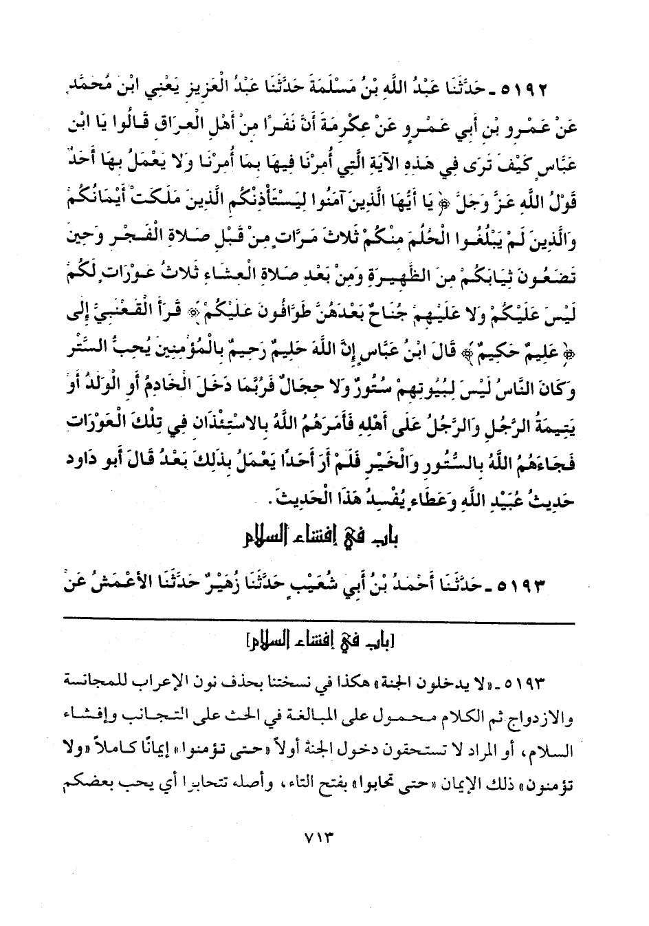5192 - حَدَّثَنَا عَبْدُ اللَّهِ بْنُ مَسْلَمَةَ، حَدَّثَنَا عَبْدُ الْعَزِيزِ يَعْنِي ابْنَ مُحَمَّدٍ، عَنْ عَمْرِو بْنِ أَبِي عَمْرٍو، عَنْ عِكْرِمَةَ، أَنَّ نَفَرًا مِنْ أَهْلِ الْعِرَاقِ قَالُوا: يَا ابْنَ عَبَّاسٍ كَيْفَ تَرَى فِي هَذِهِ الْآيَةِ الَّتِي أُمِرْنَا فِيهَا بِمَا أُمِرْنَا، وَلَا يَعْمَلُ بِهَا أَحَدٌ؟ قَوْلُ اللَّهِ عَزَّ وَجَلَّ {يَا أَيُّهَا الَّذِينَ آمَنُوا لِيَسْتَأْذِنْكُمُ الَّذِينَ مَلَكَتْ أَيْمَانُكُمْ وَالَّذِينَ لَمْ يَبْلُغُوا الْحُلُمَ مِنْكُمْ ثَلَاثَ مَرَّاتٍ مِنْ قَبْلِ صَلَاةِ الْفَجْرِ وَحِينَ تَضَعُونَ ثِيَابَكُمْ مِنَ الظَّهِيرَةِ وَمِنْ بَعْدِ صَلَاةِ الْعِشَاءِ ثَلَاثُ عَوْرَاتٍ} [النور: 58] لَكُمْ لَيْسَ عَلَيْكُمْ وَلَا عَلَيْهِمْ جُنَاحٌ بَعْدَهُنَّ طَوَّافُونَ عَلَيْكُمْ قَرَأَ الْقَعْنَبِيُّ إِلَى {عَلِيمٌ حَكِيمٌ} [النور: 59] قَالَ ابْنُ عَبَّاسٍ: «إِنَّ اللَّهَ حَلِيمٌ رَحِيمٌ بِالْمُؤْمِنِينَ يُحِبُّ السَّتْرَ، وَكَانَ النَّاسُ لَيْسَ لِبُيُوتِهِمْ سُتُورٌ وَلَا حِجَالٌ، فَرُبَّمَا دَخَلَ الْخَادِمُ أَوِ الْوَلَدُ أَوْ يَتِيمَةُ الرَّجُلِ وَالرَّجُلُ عَلَى أَهْلِهِ، فَأَمَرَهُمُ اللَّهُ بِالِاسْتِئْذَانِ فِي تِلْكَ الْعَوْرَاتِ، فَجَاءَهُمُ اللَّهُ بِالسُّتُورِ وَالْخَيْرِ، فَلَمْ أَرَ أَحَدًا يَعْمَلُ بِذَلِكَ بَعْدُ» قَالَ أَبُو دَاوُدَ: «حَدِيثُ عُبَيْدِ اللَّهِ وَعَطَاءٍ يُفْسِدُ هَذَا الْحَدِيثَ».