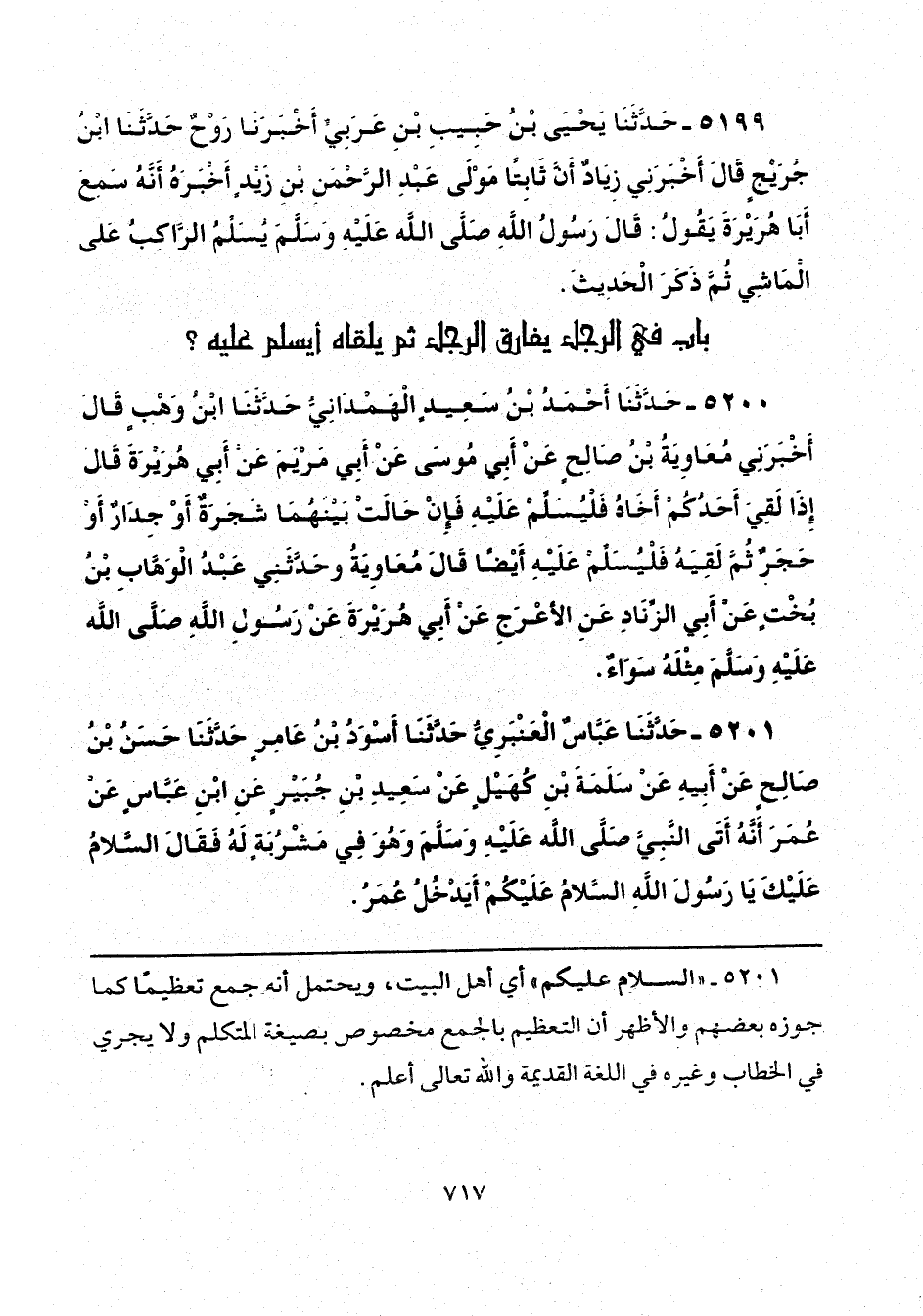 5200 - حَدَّثَنَا أَحْمَدُ بْنُ سَعِيدٍ الْهَمْدَانِيُّ، حَدَّثَنَا ابْنُ وَهْبٍ، قَالَ: أَخْبَرَنِي مُعَاوِيَةُ بْنُ صَالِحٍ، عَنْ أَبِي مُوسَى، عَنْ أَبِي مَرْيَمَ، عَنْ أَبِي هُرَيْرَةَ، قَالَ: «إِذَا لَقِيَ أَحَدُكُمْ أَخَاهُ فَلْيُسَلِّمْ عَلَيْهِ، فَإِنْ حَالَتْ بَيْنَهُمَا شَجَرَةٌ أَوْ جِدَارٌ، أَوْ حَجَرٌ ثُمَّ لَقِيَهُ فَلْيُسَلِّمْ عَلَيْهِ أَيْضًا» قَالَ مُعَاوِيَةُ، وحَدَّثَنِي عَبْدُ الْوَهَّابِ بْنُ بُخْتٍ، عَنْ أَبِي الزِّنَادِ، عَنِ الْأَعْرَجِ، عَنْ أَبِي هُرَيْرَةَ عَنْ رَسُولِ اللَّهِ صَلَّى اللهُ عَلَيْهِ وَسَلَّمَ مِثْلَهُ سَوَاءٌ.