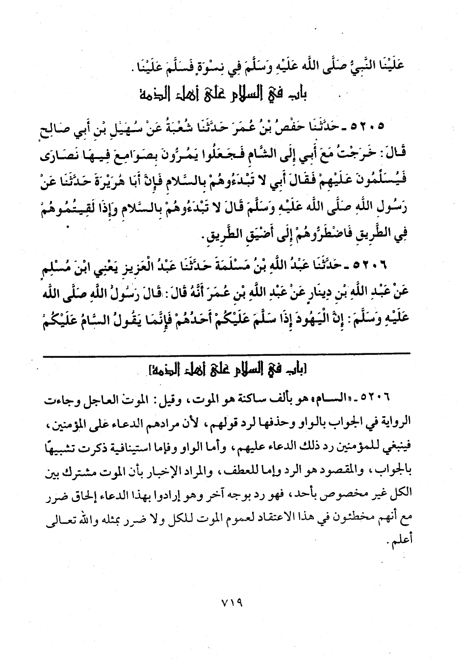 5206 - "السام" هو بألف ساكنة هو الموت، وقيل: الموت العاجل وجاءت الرواية في الجواب بالواو وحذفها لرد قولهم، لأن مرادهم الدعاء على المؤمنين، فينبغي للمؤمنين رد ذلك الدعاء عليهم، وأما الواو وفإما استينافية ذكرت تشبيهًا بالجواب، والمقصود هو الرد وإما للعطف, والمواد الإخبار بأن الموت مشترك بين الكل غير مخصوص بأحد، فهو رد بوجه آخر وهو أرادوا بهذا الدعاء إلحاق ضرر مع أنهم مخطئون في هذا الاعتقاد لعموم الموت للكل ولا ضرر بمثله والله تعالى أعلم.