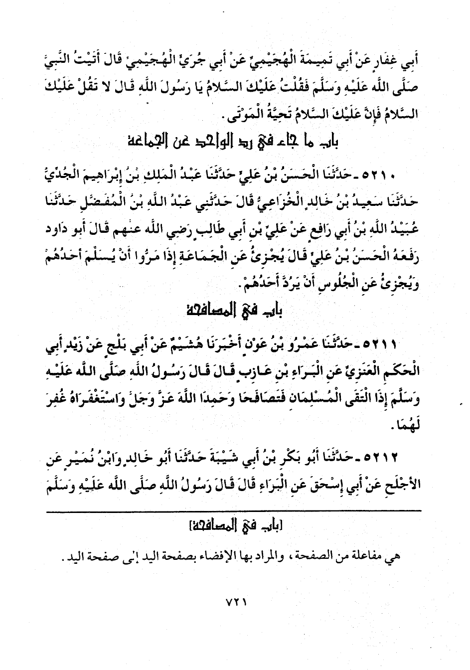 أَبِي غِفَارٍ، عَنْ أَبِي تَمِيمَةَ الْهُجَيْمِيِّ، عَنْ أَبِي جُرَيٍّ الْهُجَيْمِيِّ، قَالَ: أَتَيْتُ النَّبِيَّ صَلَّى اللهُ عَلَيْهِ وَسَلَّمَ فَقُلْتُ: عَلَيْكَ السَّلَامُ يَا رَسُولَ اللَّهِ، قَالَ: «لَا تَقُلْ عَلَيْكَ السَّلَامُ، فَإِنَّ عَلَيْكَ السَّلَامُ تَحِيَّةُ الْمَوْتَى».