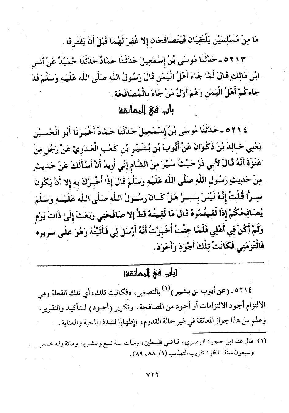 5213 - حَدَّثَنَا مُوسَى بْنُ إِسْمَاعِيلَ، حَدَّثَنَا حَمَّادٌ، حَدَّثَنَا حُمَيْدٌ، عَنْ أَنَسِ بْنِ مَالِكٍ، قَالَ: لَمَّا جَاءَ أَهْلُ الْيَمَنِ قَالَ رَسُولُ اللَّهِ صَلَّى اللهُ عَلَيْهِ وَسَلَّمَ: «قَدْ جَاءَكُمْ أَهْلُ الْيَمَنِ، وَهُمْ أَوَّلُ مَنْ جَاءَ بِالْمُصَافَحَةِ».