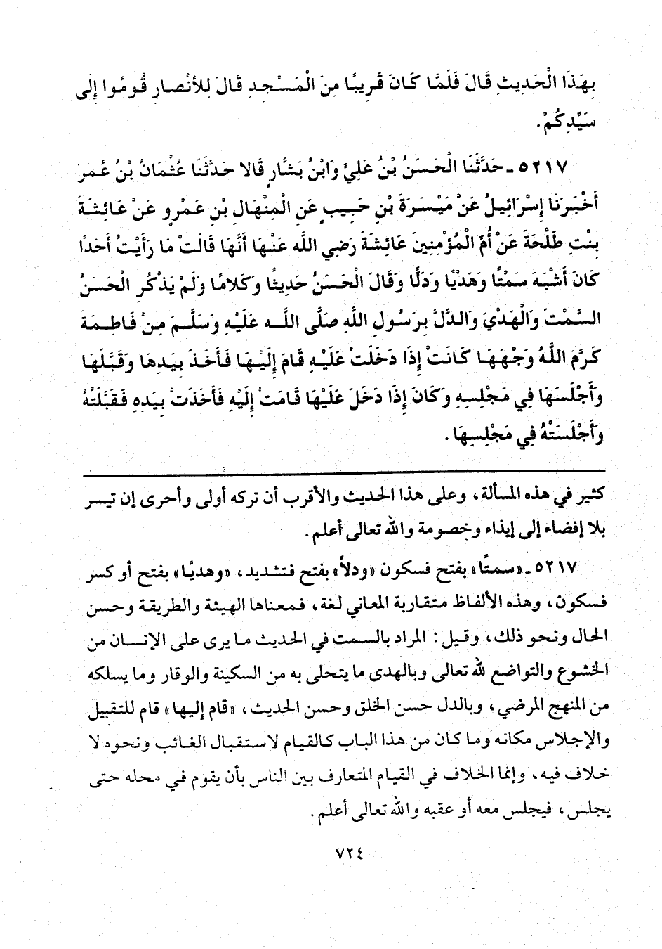 5217 - "سمتًا" بفتح فسكون "ودلًّا" بفتح فتشديد، "وهديًا" بفتح أو كسر فسكون، وهذه الألفاظ متقاربة المعاني لغة، فمعناها الهيئة والطريقة وحسن الحال ونحو ذلك، وقيل: المراد بالسمت في الحديث ما يرى على الإنسان من الخشوع والتواضع لله تعالى وبالهدى ما يتحلى به من السكينة والوقار وما يسلكه من المنهج المرضي، وبالدل حسن الخلق وحسن الحديث، "قام إِليها" قام للتقبيل والإجلاس مكانه وما كان من هذا الباب كالقيام لاستقبال الغائب ونحوه لا خلاف فيه، وإنما الخلاف في القيام المتعارف بين الناس بأن يقوم في محله حتى يجلس، فيجلس معه أو عقبه والله تعالى أعلم.