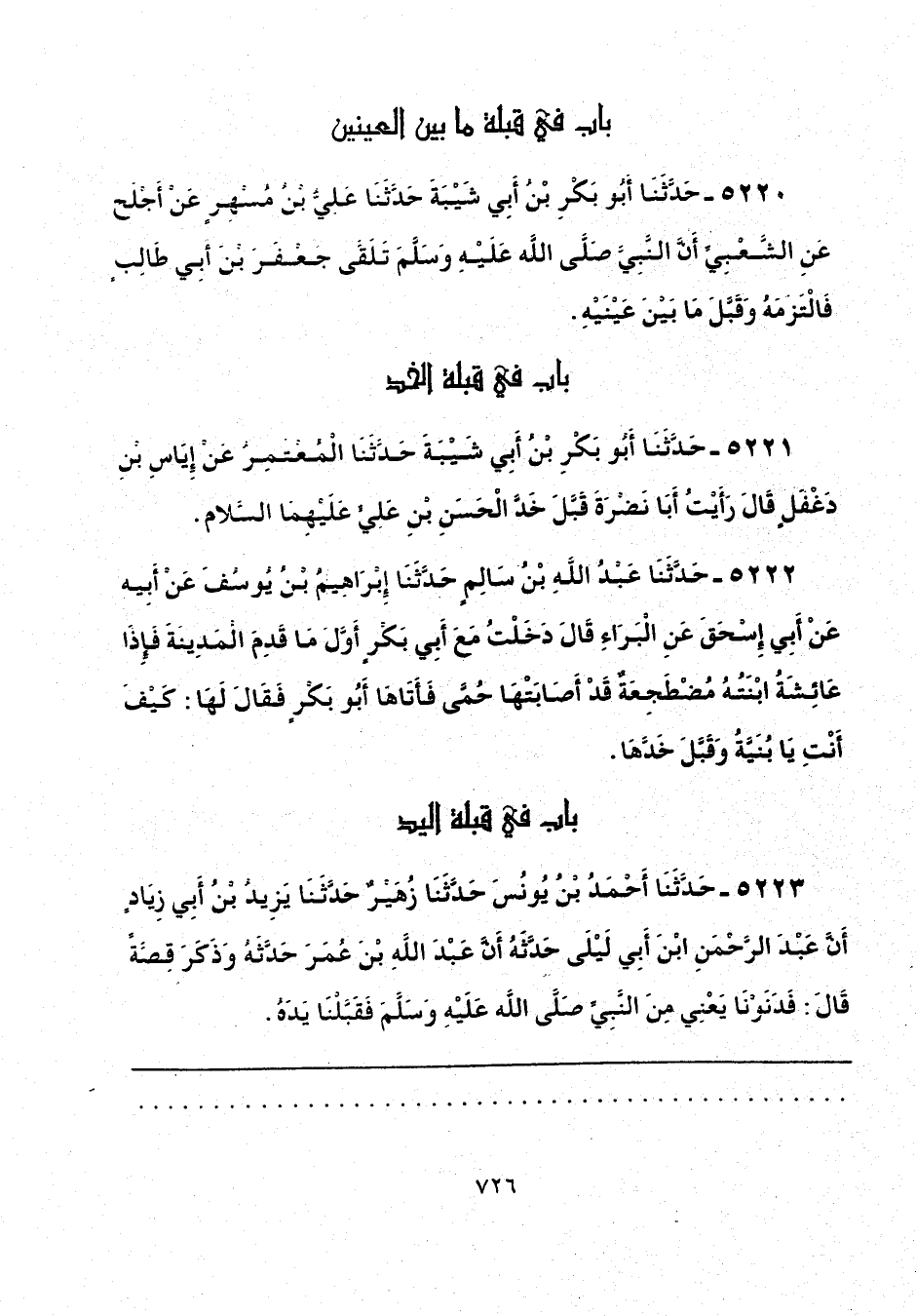 5220 - حَدَّثَنَا أَبُو بَكْرِ بْنُ أَبِي شَيْبَةَ، حَدَّثَنَا عَلِيُّ بْنُ مُسْهِرٍ، عَنْ أَجْلَحَ، عَنِ الشَّعْبِيِّ، أَنَّ النَّبِيَّ صَلَّى اللهُ عَلَيْهِ وَسَلَّمَ: «تَلَقَّى جَعْفَرَ بْنَ أَبِي طَالِبٍ فَالْتَزَمَهُ، وَقَبَّلَ مَا بَيْنَ عَيْنَيْهِ».