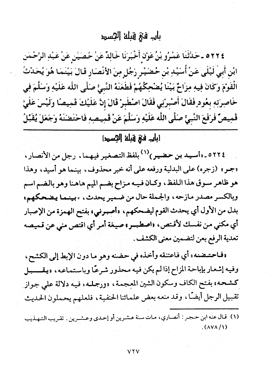 5224 - (أسيد بن حضير) (¬1) بلفظ التصغير فيهما، رجل من الأنصار، "جر" (زجره) على البدلية ورفعه على أنه خبر محذوف، بينما هو أسيد، وهذا هو ظاهر سوق هذا اللفظ، وكان فيه مزاح بضم الميم هاهنا وهو بالضم اسم وبالكسر مصدر مازحه، والجملة حال من ضمير يحدث، "بينما يضحكهم" بدل من الأول أي يحدث القوم ليضحكهم، "أصبرني" بفتح الهمزة من الإصبار أي مكني من نفسك لأقتص، "اصطبر" صيغة أمر أي اقتص مني عن قميصه تعدية الرفع بعن لتضمين معنى الكشف.