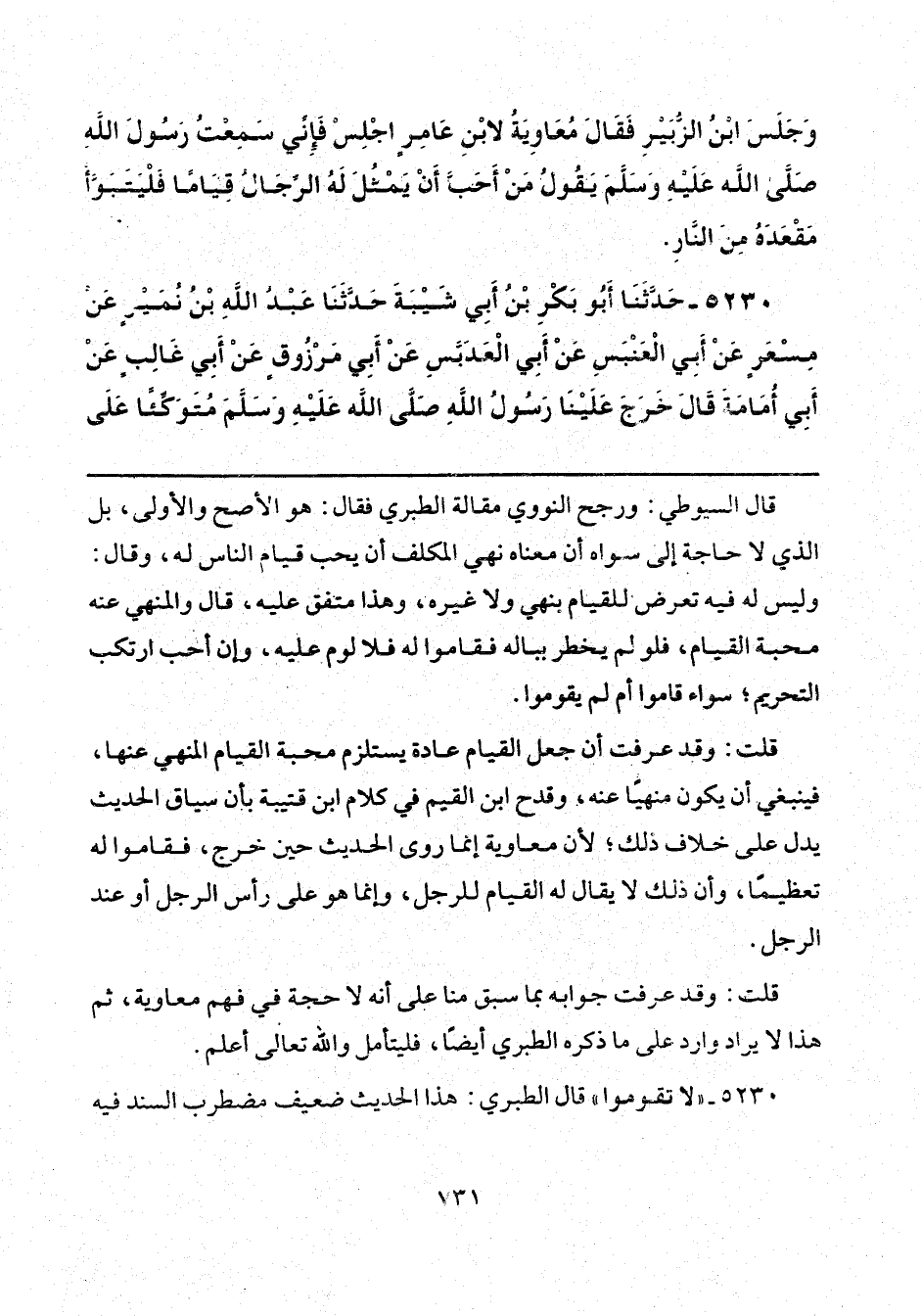 قال السيوطي: ورجح النووي مقالة الطبري فقال: هو الأصح والأولى، بل الذي لا حاجة إلى سواه أن معناه نهي المكلف أن يحب قيام الناس له، وقال: وليس له فيه تعرض للقيام بنهي ولا غيره، وهذا متفق عليه، قال والمنهي عنه محبة القيام، فلو لم يخطر بباله فقاموا له فلا لوم عليه، وإن أحب أرتكب التحريم؛ سواء قاموا أم لم يقوموا.
