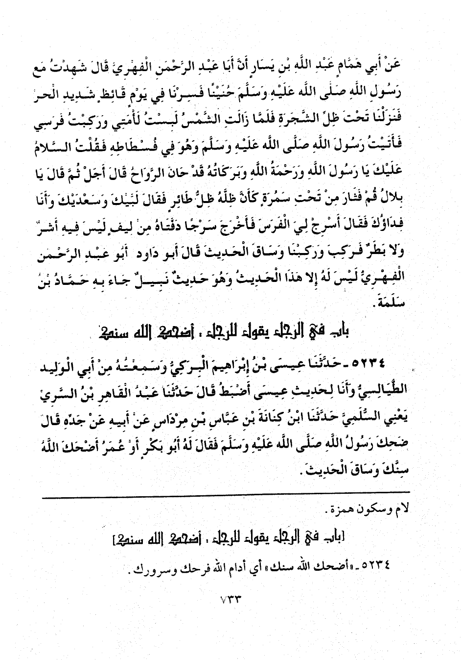 5234 - حَدَّثَنَا عِيسَى بْنُ إِبْرَاهِيمَ الْبِرَكِيُّ، وَسَمِعْتُهُ مِنْ أَبِي الْوَلِيدِ الطَّيَالِسِيُّ، - وَأَنَا لِحَدِيثِ عِيسَى أَضْبَطُ -، قَالَ: حَدَّثَنَا عَبْدُ الْقَاهِرِ بْنُ السَّرِيِّ يَعْنِي السُّلَمِيَّ، حَدَّثَنَا ابْنُ كِنَانَةَ بْنِ عَبَّاسِ بْنِ مِرْدَاسٍ، عَنْ أَبِيهِ، عَنْ جَدِّهِ، قَالَ: "ضَحِكَ رَسُولُ اللَّهِ صَلَّى اللهُ عَلَيْهِ وَسَلَّمَ، فَقَالَ لَهُ: أَبُو بَكْرٍ أَوْ عُمَرُ أَضْحَكَ اللَّهُ سِنَّكَ - وَسَاقَ الْحَدِيثَ -".