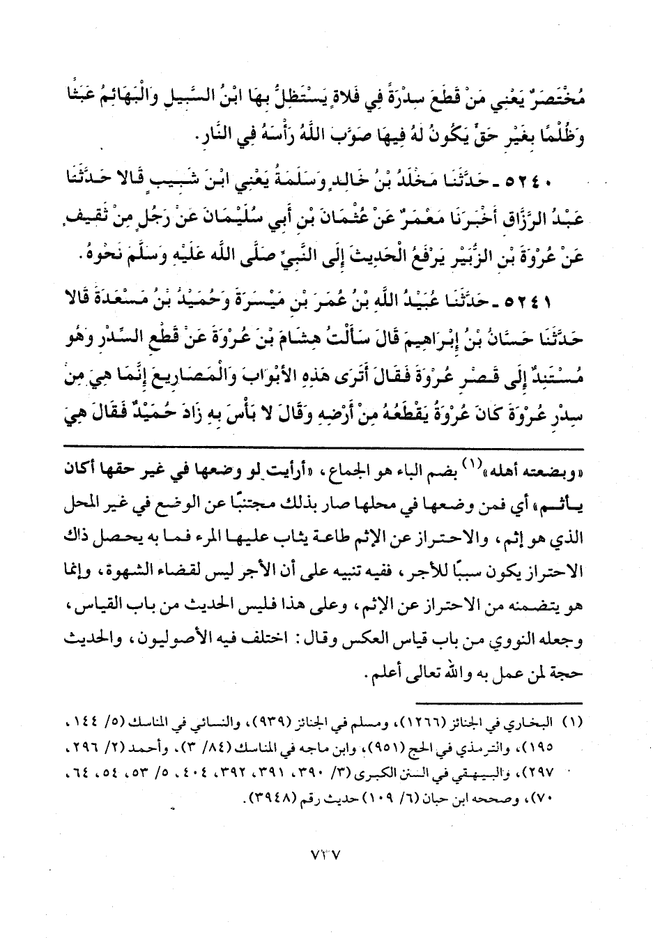 5241 - حَدَّثَنَا عُبَيْدُ اللَّهِ بْنُ عُمَرَ بْنِ مَيْسَرَةَ، وَحُمَيْدُ بْنُ مَسْعَدَةَ، قَالَا: حَدَّثَنَا حَسَّانُ بْنُ إِبْرَاهِيمَ، قَالَ: سَأَلْتُ هِشَامَ بْنَ عُرْوَةَ عَنْ قَطْعِ السِّدْرِ، وَهُوَ مُسْتَنِدٌ إِلَى قَصْرِ عُرْوَةَ فَقَالَ: أَتَرَى هَذِهِ الْأَبْوَابَ وَالْمَصَارِيعَ إِنَّمَا هِيَ مِنْ سِدْرِ عُرْوَةَ كَانَ عُرْوَةُ يَقْطَعُهُ مِنْ أَرْضِهِ وَقَالَ: لَا بَأْسَ بِهِ زَادَ حُمَيْدٌ فَقَالَ: هِيَ