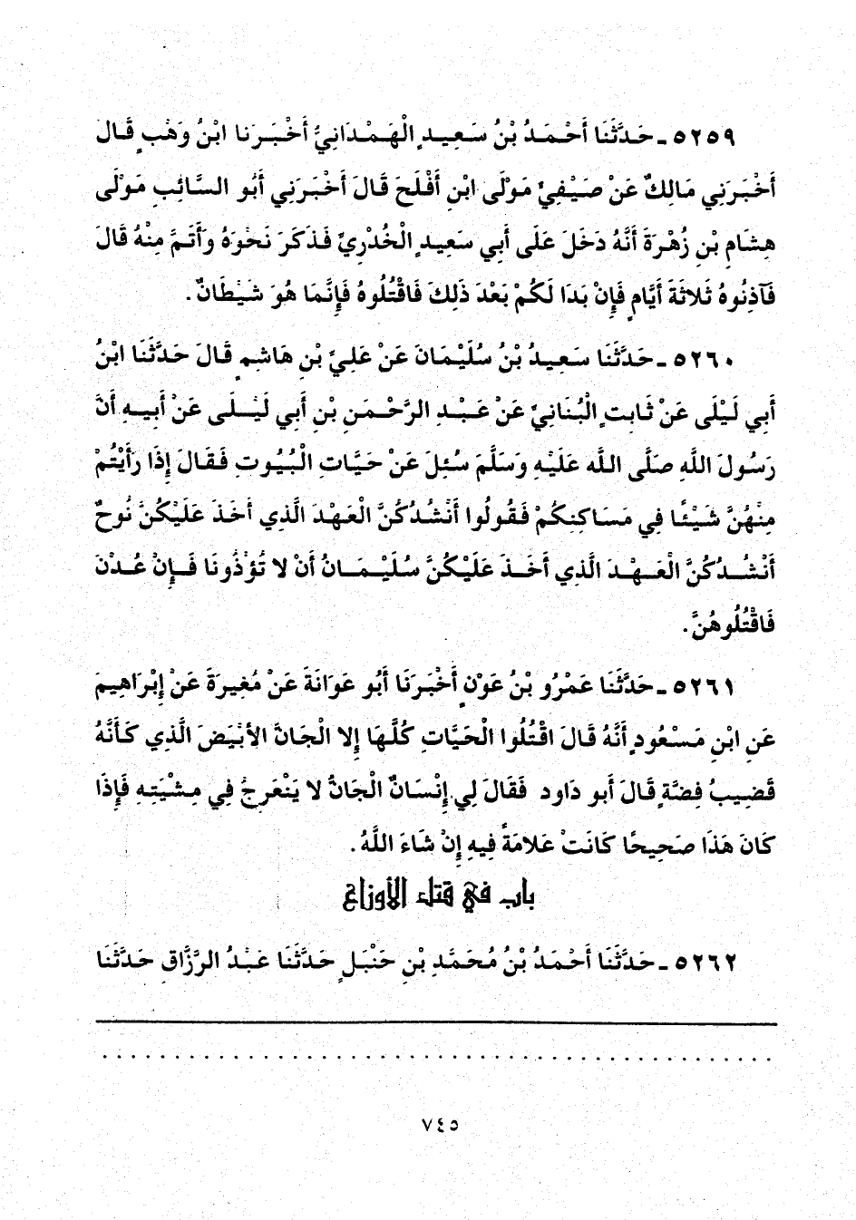 5261 - حَدَّثَنَا عَمْرُو بْنُ عَوْنٍ، أَخْبَرَنَا أَبُو عَوَانَةَ، عَنْ مُغِيرَةَ، عَنْ إِبْرَاهِيمَ، عَنِ ابْنِ مَسْعُودٍ، أَنَّهُ قَالَ: «اقْتُلُوا الْحَيَّاتِ كُلَّهَا، إِلَّا الْجَانَّ الْأَبْيَضَ، الَّذِي كَأَنَّهُ قَضِيبُ فِضَّةٍ» قَالَ أَبُو دَاوُدَ: «فَقَالَ لِي إِنْسَانٌ الْجَانُّ لَا يَنْعَرِجُ فِي مِشْيَتِهِ، فَإِذَا كَانَ هَذَا صَحِيحًا كَانَتْ عَلَامَةً فِيهِ إِنْ شَاءَ اللَّهُ».