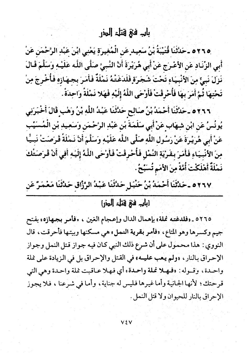 5265 - "فلدغته نملة" بإهمال الدال وإعجام الغين, "فأمر بجهازه" بفتح جيم وكسرها وهو المتاع، "فأمر بقرية النمل" هي مسكنها وبيتها فأحرقت، قال النووي: هذا محمول على أن شرع ذلك النبي كان فيه جواز قتل النمل وجواز الإحراق بالنار، "ولم يعب عليه" في القتل والإحراق بل في الزيادة على نملة واحدة، وقوله: "فهلا نملة واحدة" أي فهلا عاقبت نملة واحدة وهي التي قرحتك؛ لأنها الجانية وأما غيرها فليس له جناية، وأما في شرعنا، فلا يجوز الإحراق بالنار للحيوان ولا قتل النمل.