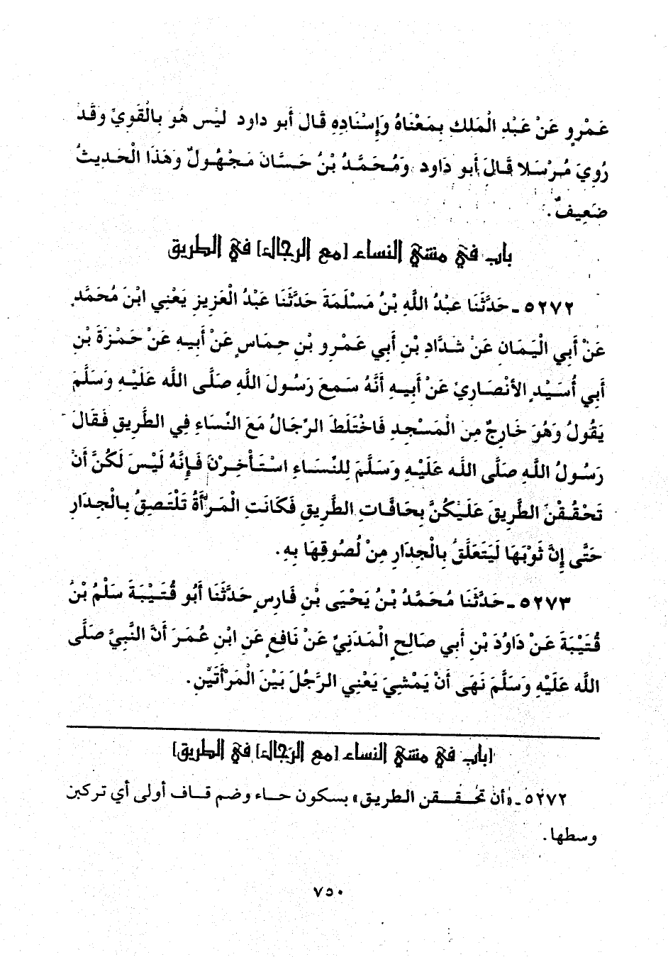 5273 - حَدَّثَنَا مُحَمَّدُ بْنُ يَحْيَى بْنِ فَارِسٍ، حَدَّثَنَا أَبُو قُتَيْبَةَ سَلْمُ بْنُ قُتَيْبَةَ، عَنْ دَاوُدَ بْنِ أَبِي صَالِحٍ الْمَدَنِيِّ، عَنْ نَافِعٍ، عَنِ ابْنِ عُمَرَ: «أَنَّ النَّبِيَّ صَلَّى اللهُ عَلَيْهِ وَسَلَّمَ، نَهَى أَنْ يَمْشِيَ يَعْنِي الرَّجُلَ بَيْنَ الْمَرْأَتَيْنِ».