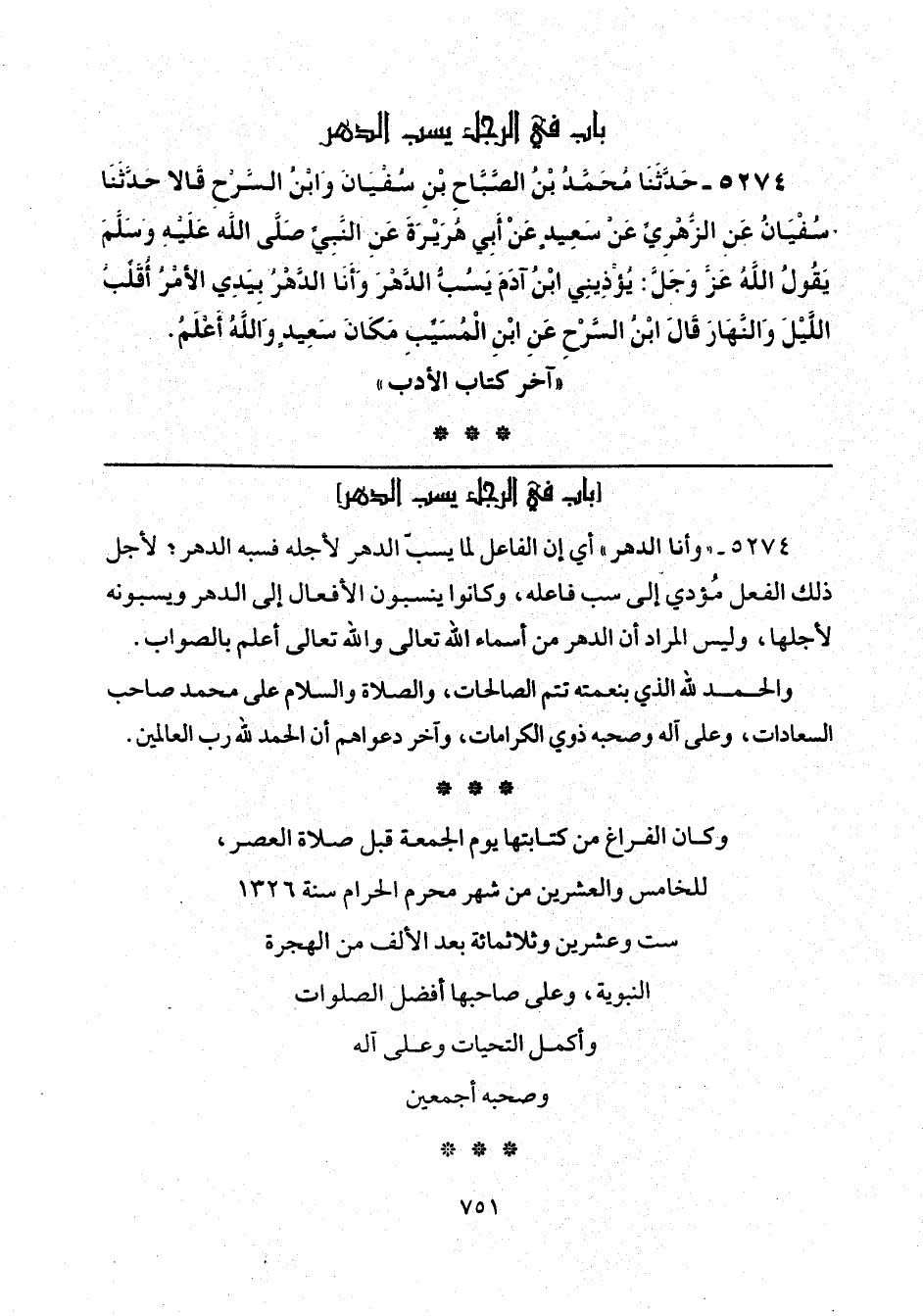وكان الفراغ من كتابتها يوم الجمعة قبل صلاة العصر، للخامس والعشرين من شهر محرم الحرام سنة 1326 ست وعشرين وثلاثمائة بعد الألف من الهجرة النبوية، وعلى صاحبها أفضل الصلوات وأكمل التحيات وعلى آله وصحبه أجمعين.