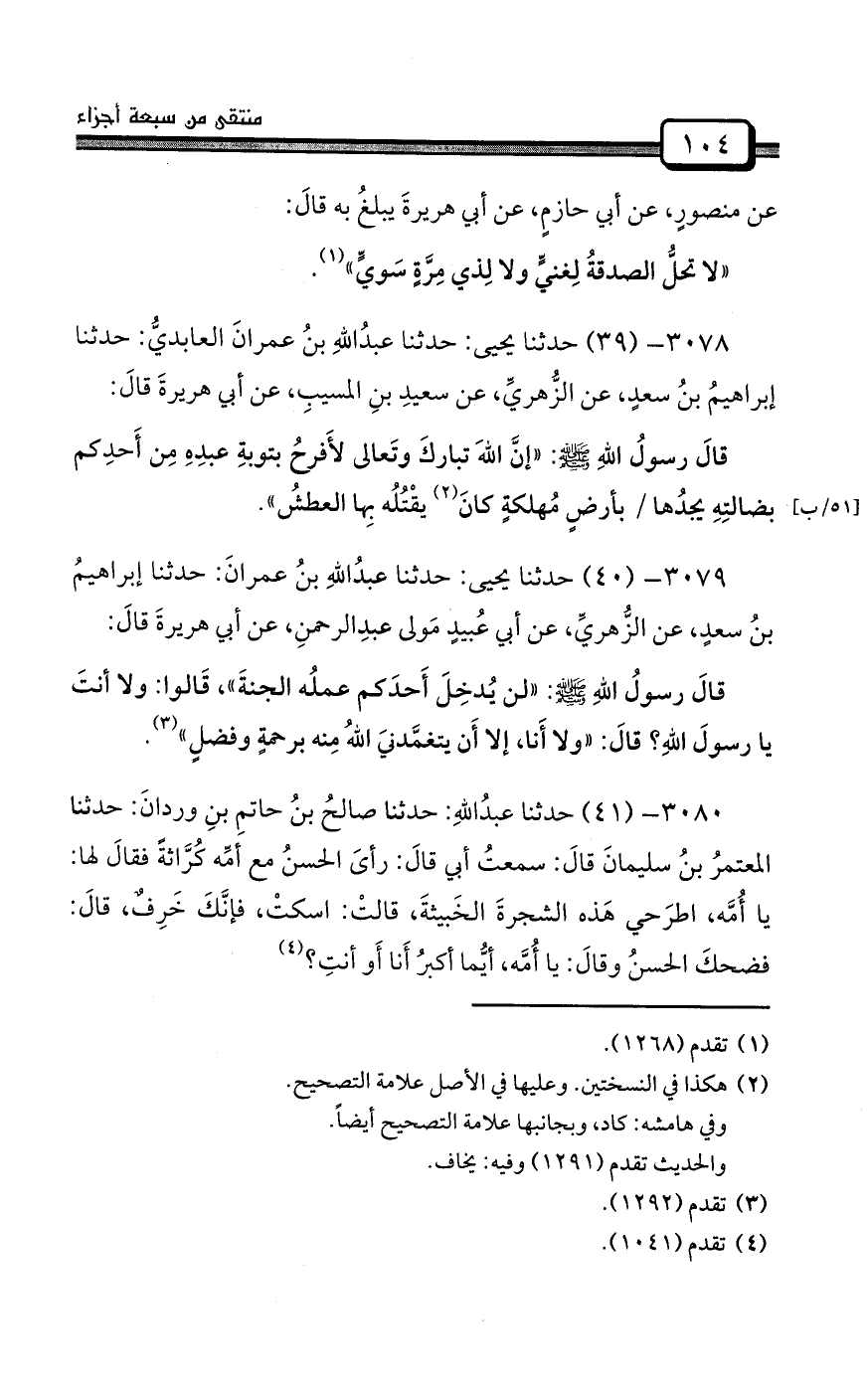 3074- (35) حدثنا عبدُاللهِ: حدثنا عثمانُ بنُ أبي شيبةَ: حدثنا إسماعيلُ بنُ عياشٍ أبوعتبةَ، عن صالحِ بنِ كيسانَ، عن الأعرجِ، عن أبي هريرةَ قالَ:
